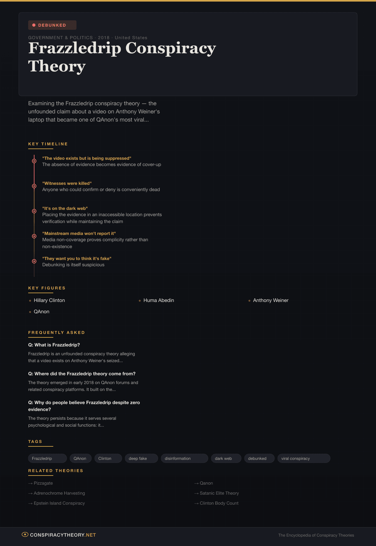 Frazzledrip is worth documenting not because it has any evidentiary basis — it has none — but because it represents the outer boundary of conspiratorial thinking, where the need to demonize political opponents completely overwhelms any connection to reality. It also demonstrates how the most extreme claims can spread virally precisely because of their extremity, and how emotional manipulation through claims about children is used as a radicalization tool.