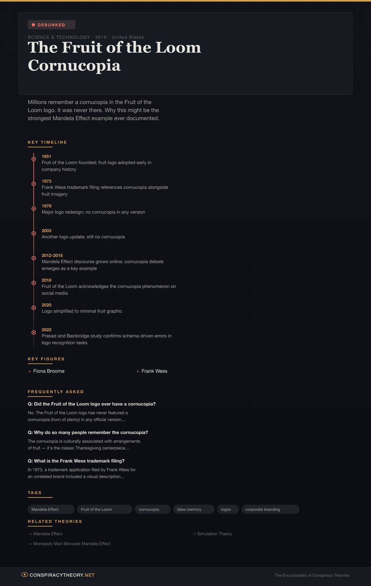 There has never been a cornucopia in the Fruit of the Loom logo. The company has confirmed this. Former designers have confirmed this. Every archived version of the logo confirms this. And yet the false memory persists with a ferocity that makes the Berenstain Bears spelling look like a minor misunderstanding.