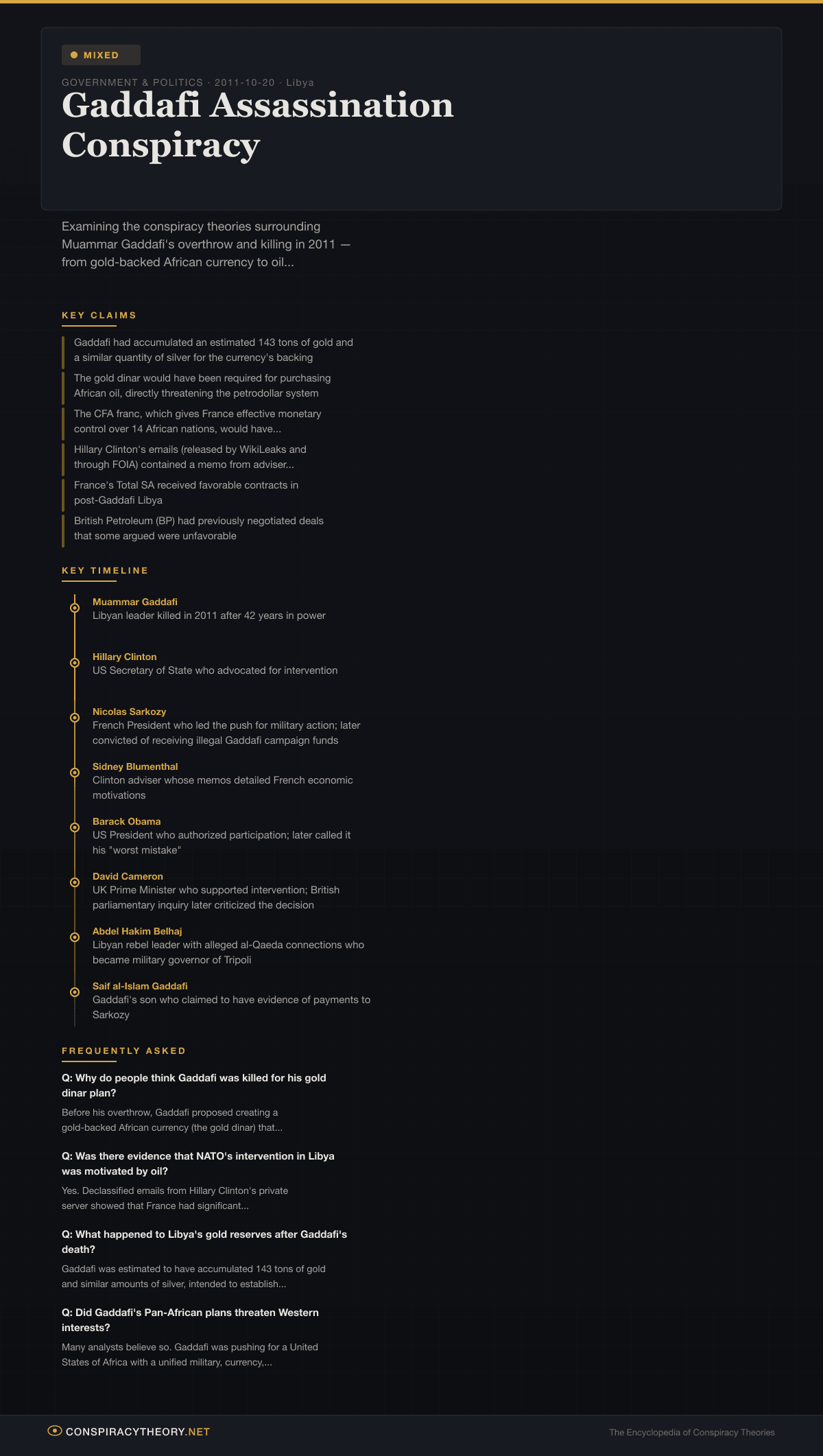The conspiracy theories surrounding Gaddafi’s death are unusual in that subsequent disclosures — particularly Hillary Clinton’s emails released in 2016 — have partially confirmed what conspiracy theorists long suspected: that the intervention was motivated far more by economic interests, currency politics, and geopolitical competition than by humanitarian concern. This makes the Gaddafi assassination conspiracy a “mixed” case — some claims remain speculative while others have been substantially validated by documentary evidence.