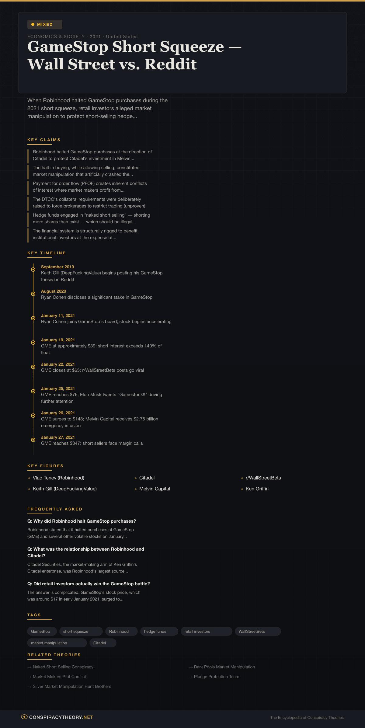 The theory is classified as “mixed” because while the specific coordination claim remains unproven, the structural critique embedded in the conspiracy narrative — that markets are designed in ways that systematically advantage institutional participants over retail investors — was largely validated by regulators’ own subsequent assessments and reform efforts.