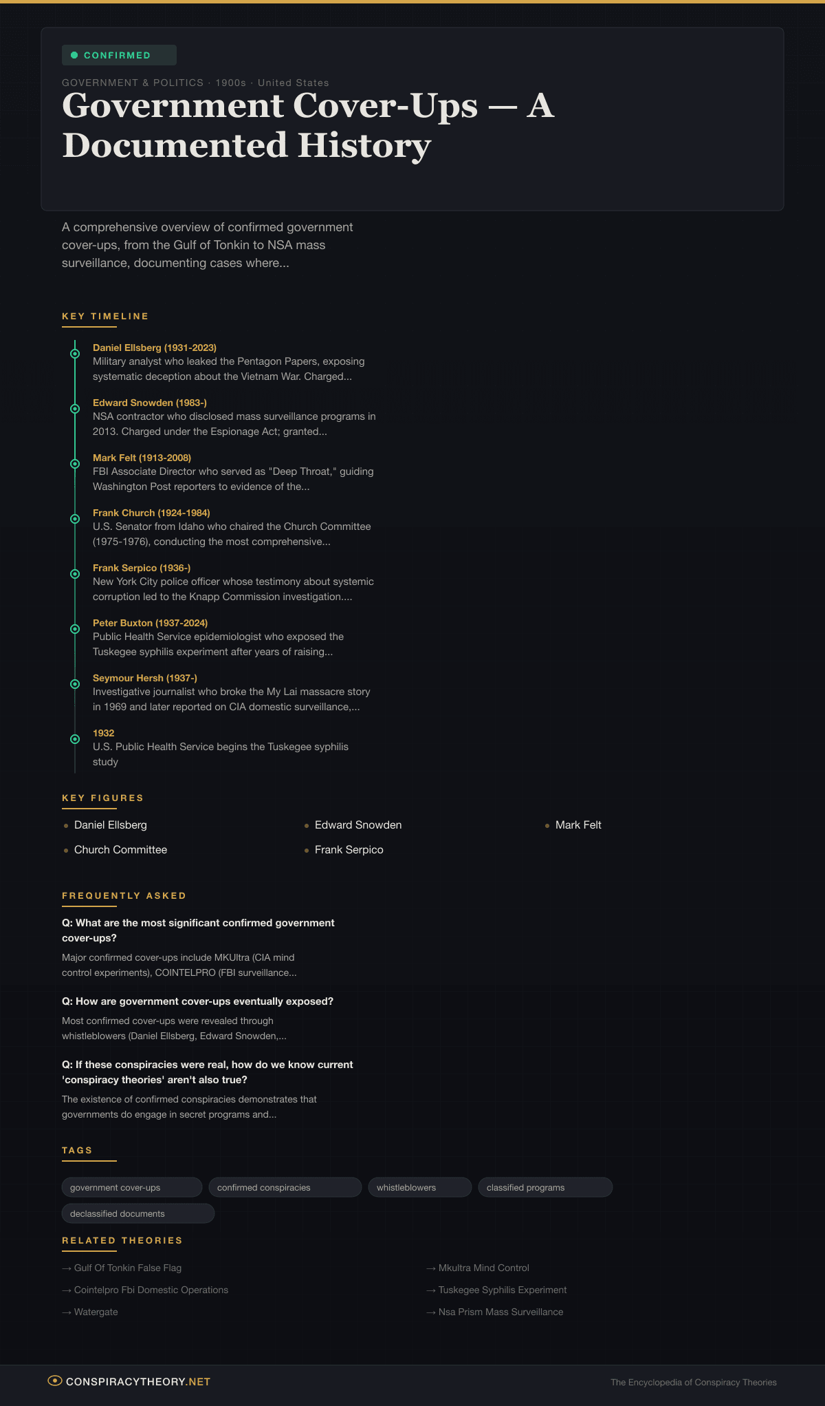 This article serves as an overview of confirmed government cover-ups, organized by category and spanning more than a century of documented cases. Each entry summarizes what was concealed, how the cover-up was maintained, and what eventually brought it to light. Where dedicated articles exist on this site, they are linked for further reading.