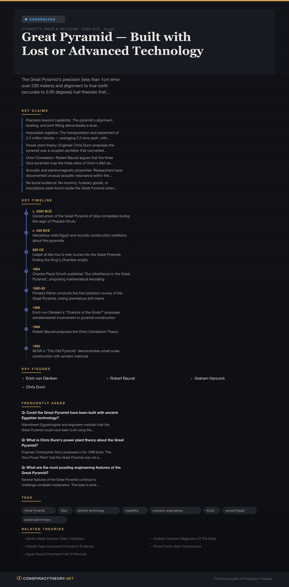 The theory that the Great Pyramid was built using lost or advanced technology — potentially including tools, methods, or knowledge unknown to mainstream Egyptology — encompasses a spectrum of claims. At the conservative end, some researchers simply argue that the Egyptians possessed engineering techniques that have not yet been fully identified or understood. At the more speculative end, theorists propose that the pyramid was built with assistance from a lost pre-Egyptian civilization, extraterrestrial beings, or technologies based on physics not recognized by modern science. Some theorists even argue that the pyramid was not a tomb at all but rather a machine — a power plant, an astronomical observatory, or a device for producing specific acoustic or electromagnetic effects.