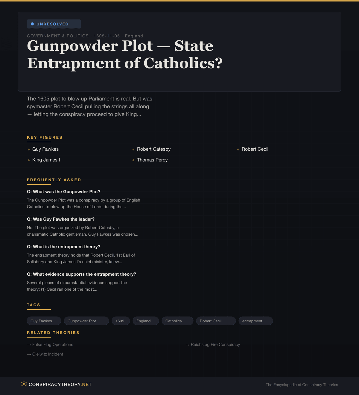 Most historians accept that the Gunpowder Plot was a genuine Catholic conspiracy but acknowledge that Cecil almost certainly had some advance intelligence about it. The debate is not whether Cecil knew — it’s how much he knew, how early he knew it, and whether he actively facilitated the plot’s development to maximize its propaganda value.
