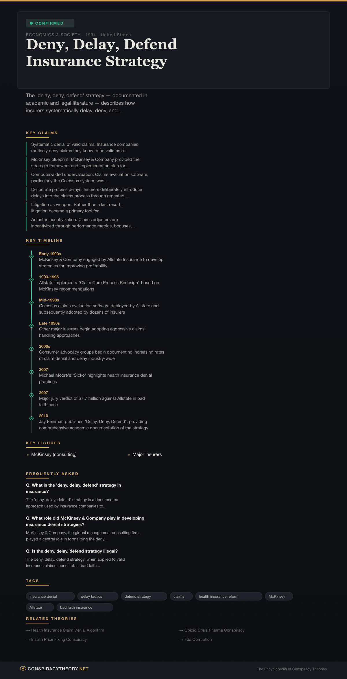 Academic documentation: Professor Jay Feinman’s Delay, Deny, Defend (2010) provides a comprehensive academic analysis of the strategy, based on court records, regulatory filings, and industry data. Additional academic studies have documented the pattern in specific insurance sectors including health, disability, and property insurance.