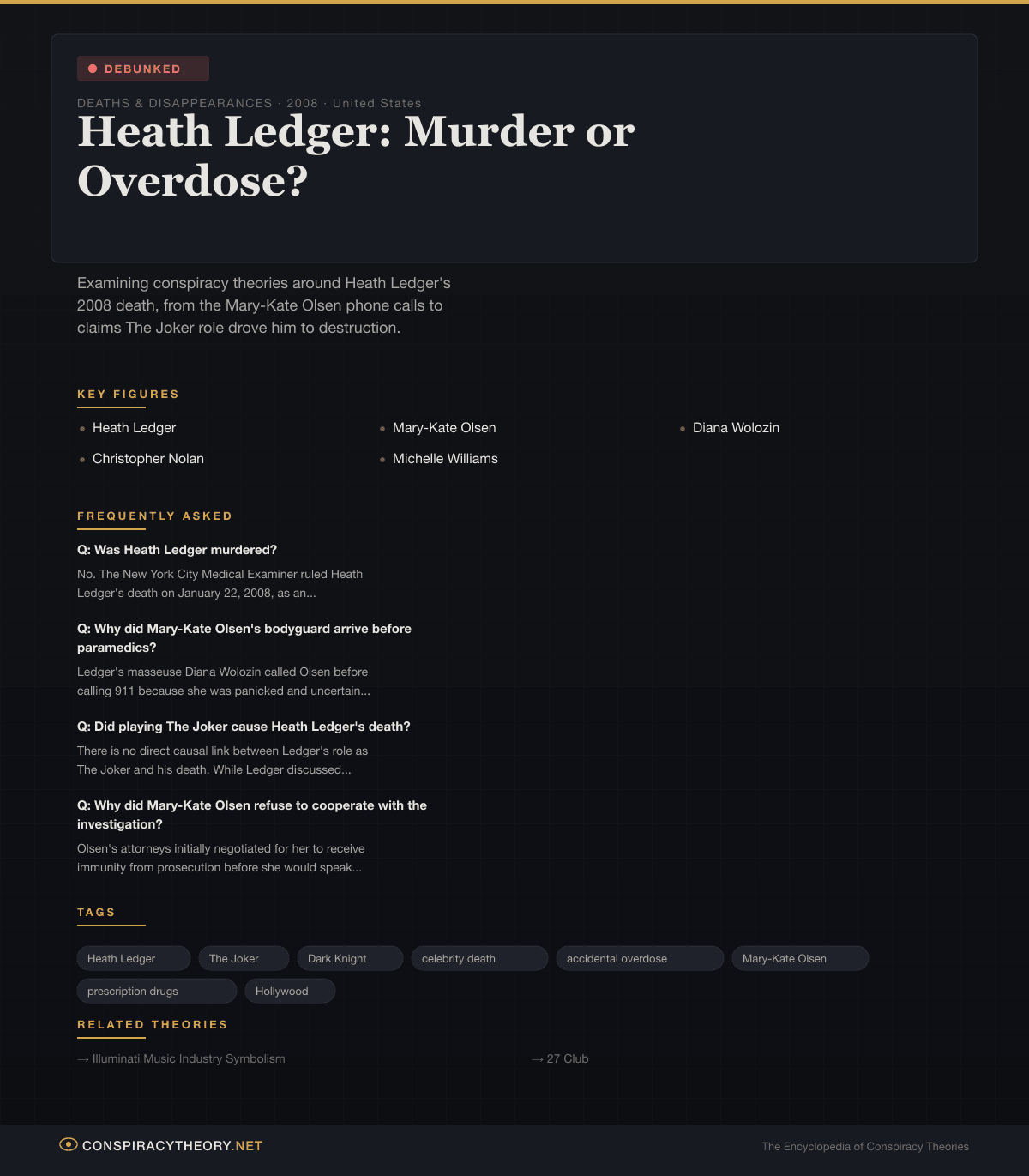 The most extreme theories frame Ledger’s death as a ritualistic sacrifice by the Illuminati or other elite secret societies that allegedly control Hollywood. Proponents point to supposed occult symbolism in The Dark Knight, the timing of Ledger’s death, and the general framework of celebrity-sacrifice conspiracy theories that posit famous people are killed as offerings to maintain the power structures of the entertainment industry.