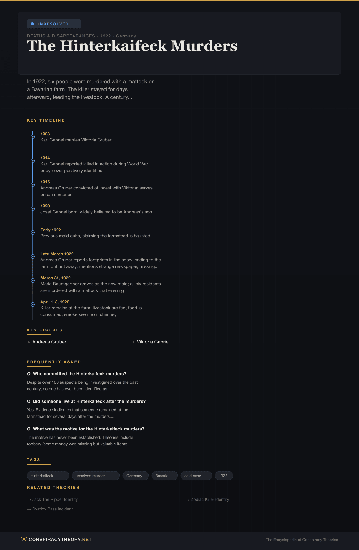 The Hinterkaifeck case shares thematic DNA with other notorious unsolved crimes where the identity of the killer has become an enduring public obsession. The Jack the Ripper identity debate and the Zodiac Killer investigation both involve cases where extensive suspect lists and circumstantial evidence led nowhere, and where the passage of time has made resolution increasingly unlikely. The Dyatlov Pass incident shares Hinterkaifeck’s atmospheric isolation and the sense that the full truth died with the victims in a remote place where the landscape itself seemed complicit in the crime.