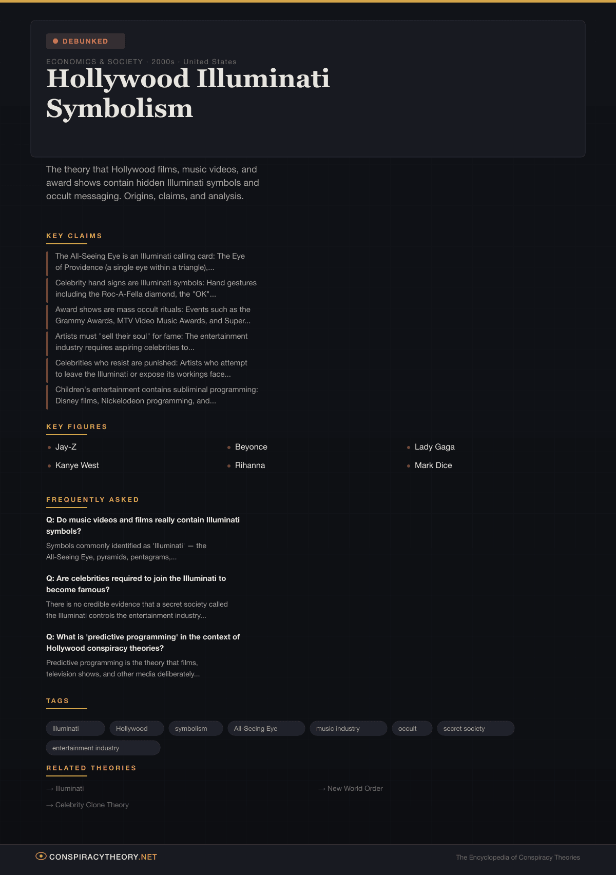 The theory is classified as debunked because it relies on unfalsifiable pattern recognition applied to common cultural symbols, attributes to a non-existent organizational conspiracy what is more parsimoniously explained by marketing strategy, artistic tradition, and confirmation bias, and because the historical Illuminati ceased to exist as an organization in the 1780s with no credible evidence of continuity.