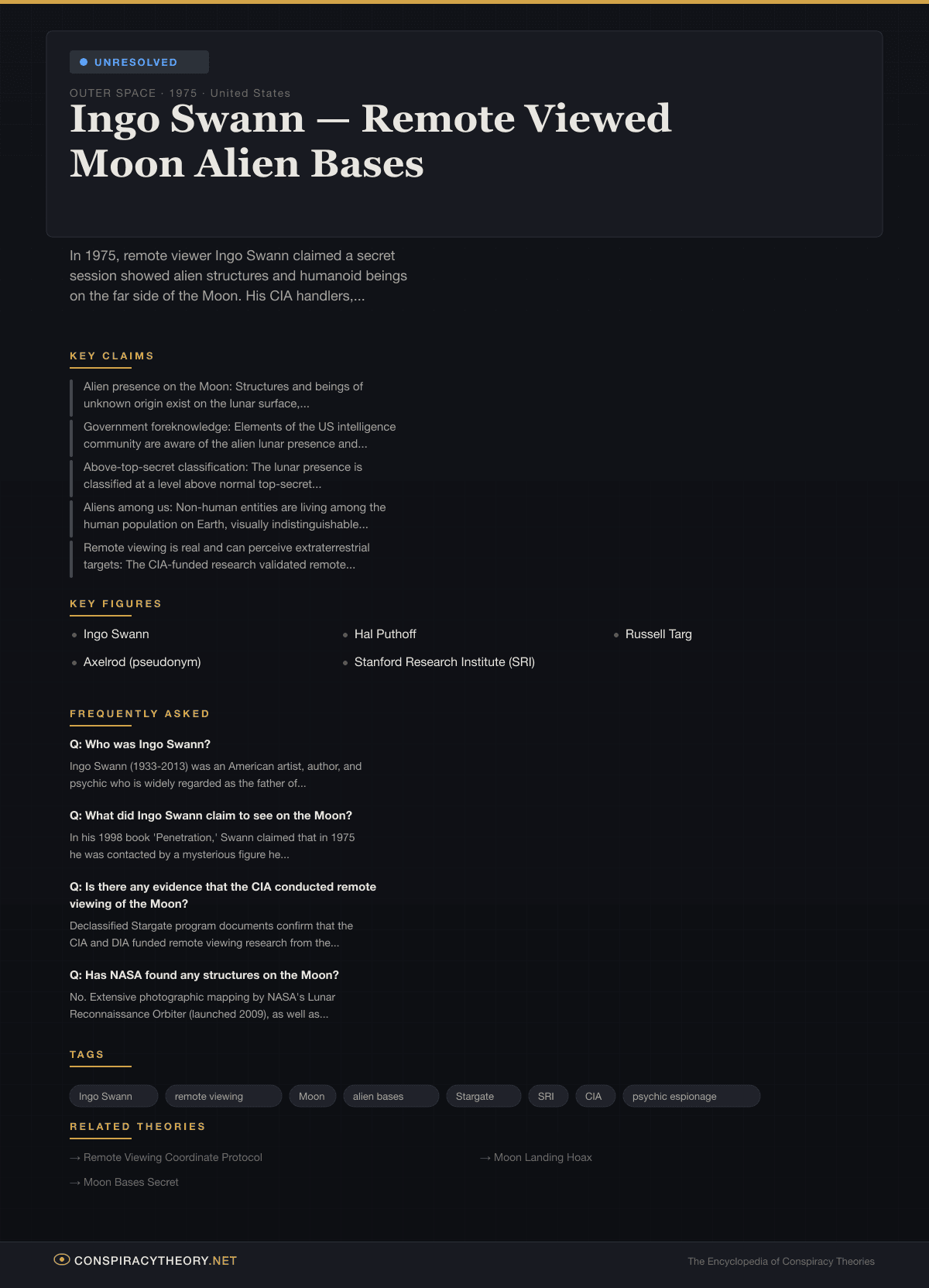 - Ingo Swann (1933-2013): Artist, psychic, and remote viewing pioneer who made the Moon viewing claims.