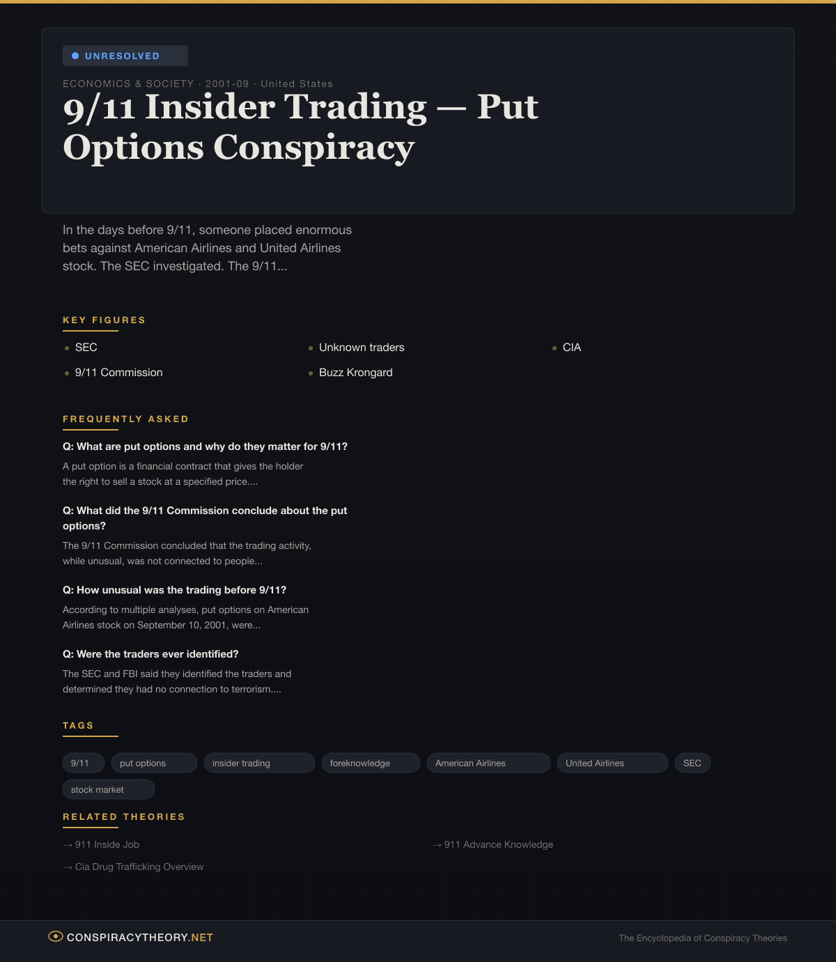 The 9/11 put options story has become one of the most frequently cited pieces of evidence by 9/11 conspiracy theorists, precisely because it doesn’t require exotic theories about controlled demolition or missile strikes. It requires only believing that someone made money from foreknowledge — something that happens routinely in the financial world (insider trading is a multi-billion-dollar enforcement problem).
