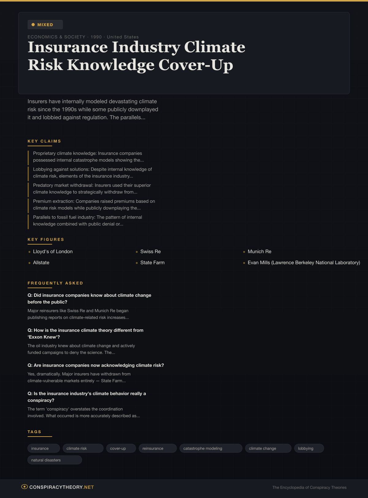 The conspiracy framing overstates coordination. The insurance industry is not a monolith. It includes companies that were climate leaders (Swiss Re), companies that were climate laggards (various US primary insurers), and a vast middle that adapted slowly and unevenly. Characterizing this as a coordinated cover-up imports a level of intentional coordination that doesn’t match the messy, competitive reality.