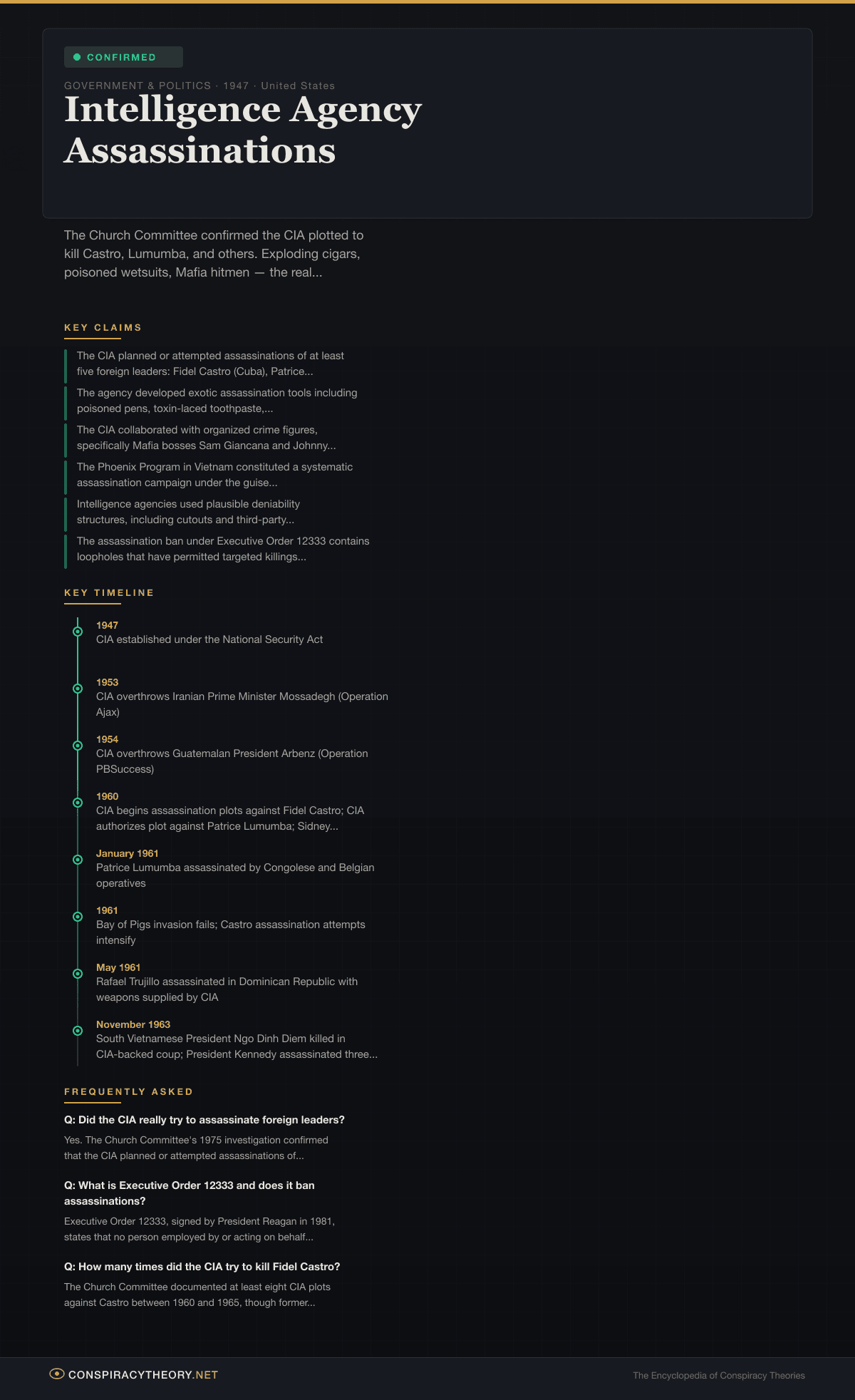 Intelligence agency assassinations refer to the documented history of the United States Central Intelligence Agency and other intelligence services planning, attempting, or facilitating the killing of foreign leaders, political figures, and perceived threats to national security. While long dismissed as paranoid fantasy, the 1975 Church Committee investigation confirmed that the CIA had indeed engaged in multiple assassination plots against foreign heads of state during the Cold War era.