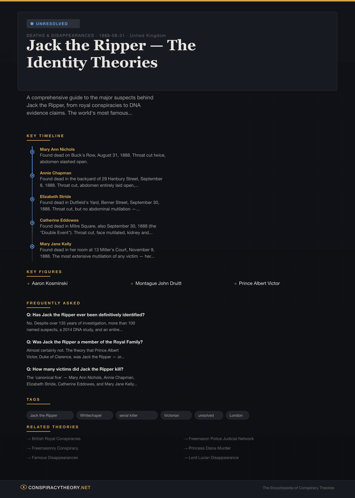 The Ripper case is, in some sense, the original cold case investigation, the template for every true crime obsession that followed. It is also a reminder that some cases simply cannot be solved — that the passage of time, the loss of evidence, and the death of every possible witness can place a crime permanently beyond the reach of certainty.