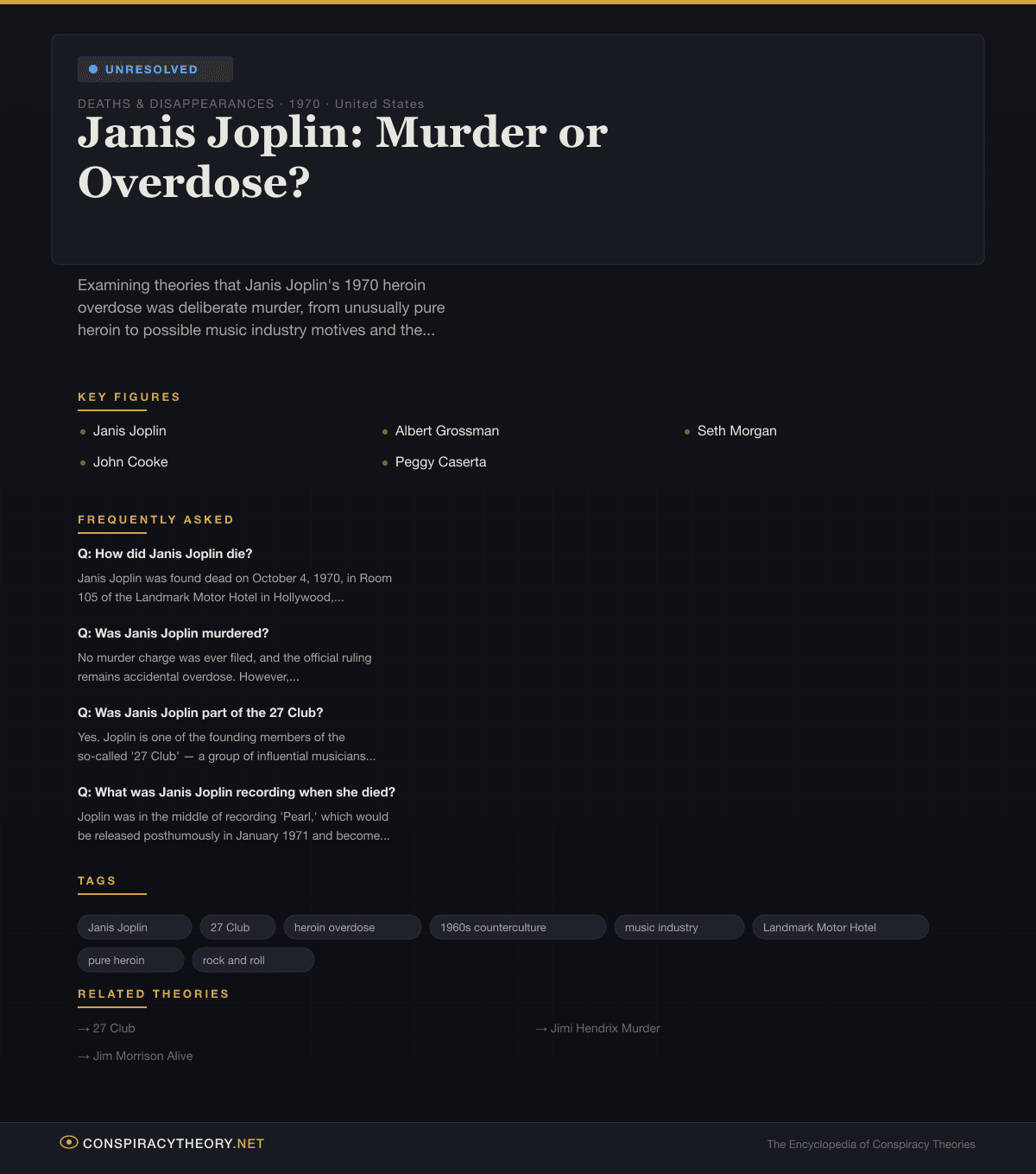 Conspiracy theorists argue that the supply of unusually pure heroin was not accidental but deliberate — that someone wanted Joplin dead and provided her with heroin that they knew would kill her. The fact that the source of the heroin was never identified adds to the suspicion.