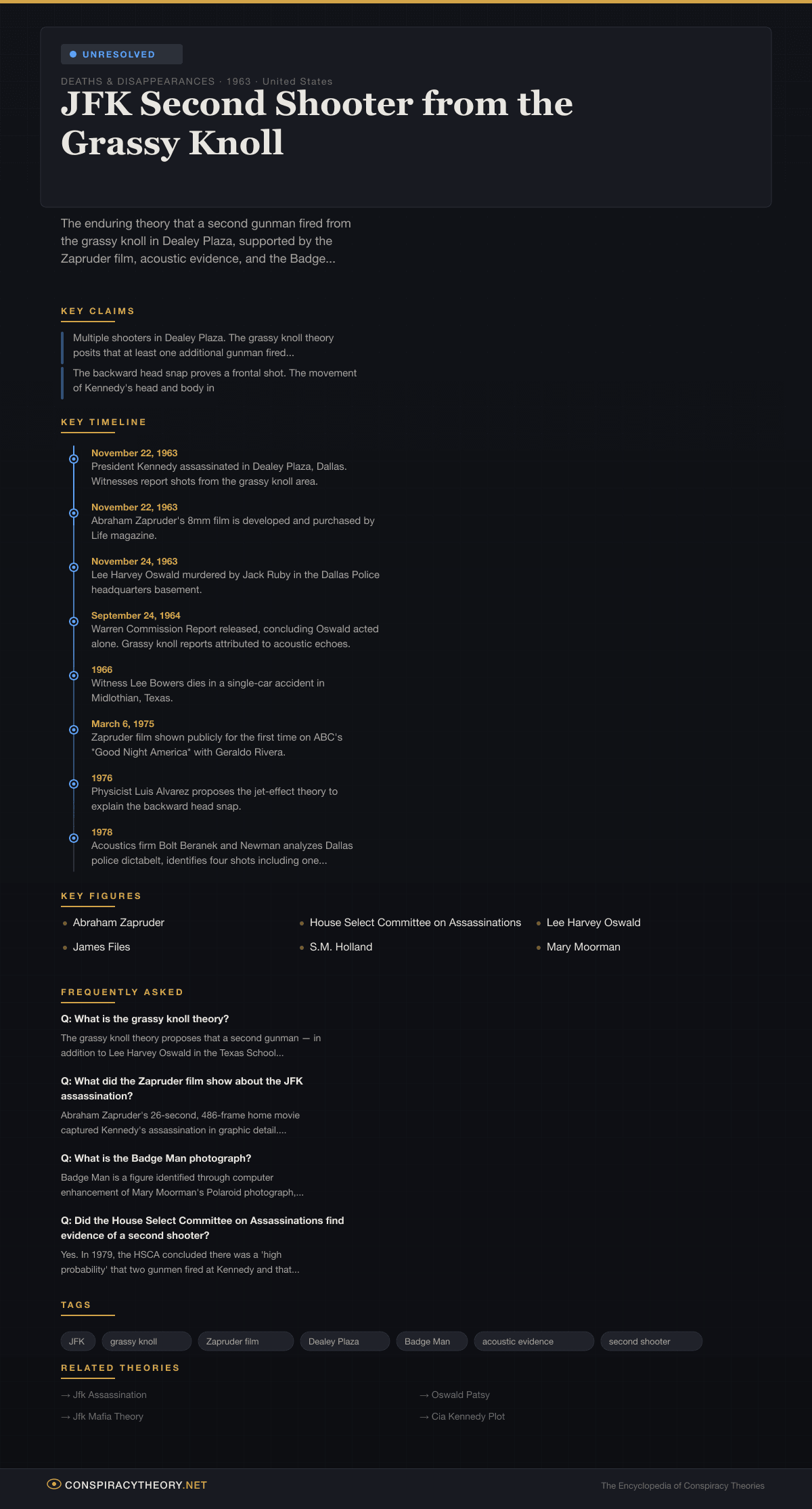 - JFK Assassination — the broader umbrella of theories surrounding Kennedy’s death