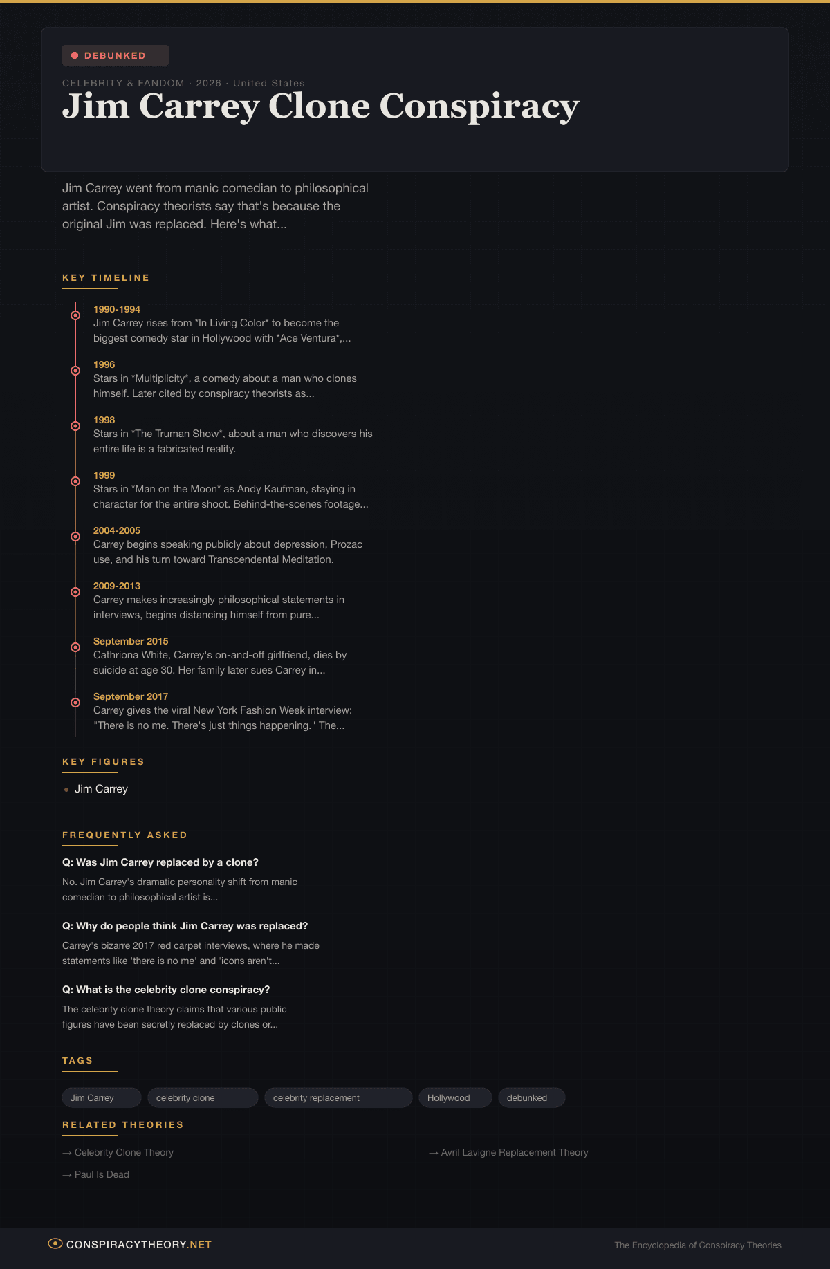 The Jim Carrey clone theory is one of the more compelling entries in the celebrity clone conspiracy canon, not because the evidence is good — it isn’t — but because the raw material is unusually rich. Most celebrity replacement theories rely on a single data point: a rapper lost weight in prison, a singer aged out of her tomboy phase. Carrey gave the theorists a full psychological metamorphosis, broadcast in high definition, stretched across years of increasingly strange public behavior. He went from being arguably the most physically manic performer in Hollywood history to a guy who paints abstract art and talks about the dissolution of the ego. That’s not a minor adjustment. That’s a personality transplant.