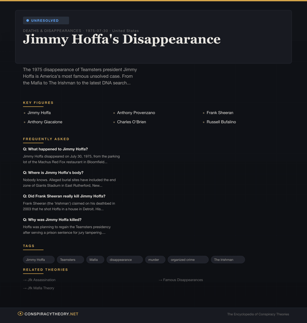 Hoffa’s disappearance has become America’s most famous unsolved case — a cultural touchstone that transcends the actual details of organized crime politics. The question “where’s Jimmy Hoffa?” works as a joke because everyone knows the setup: he’s been missing so long that the mystery has become the story, and the man himself has faded behind the legend.