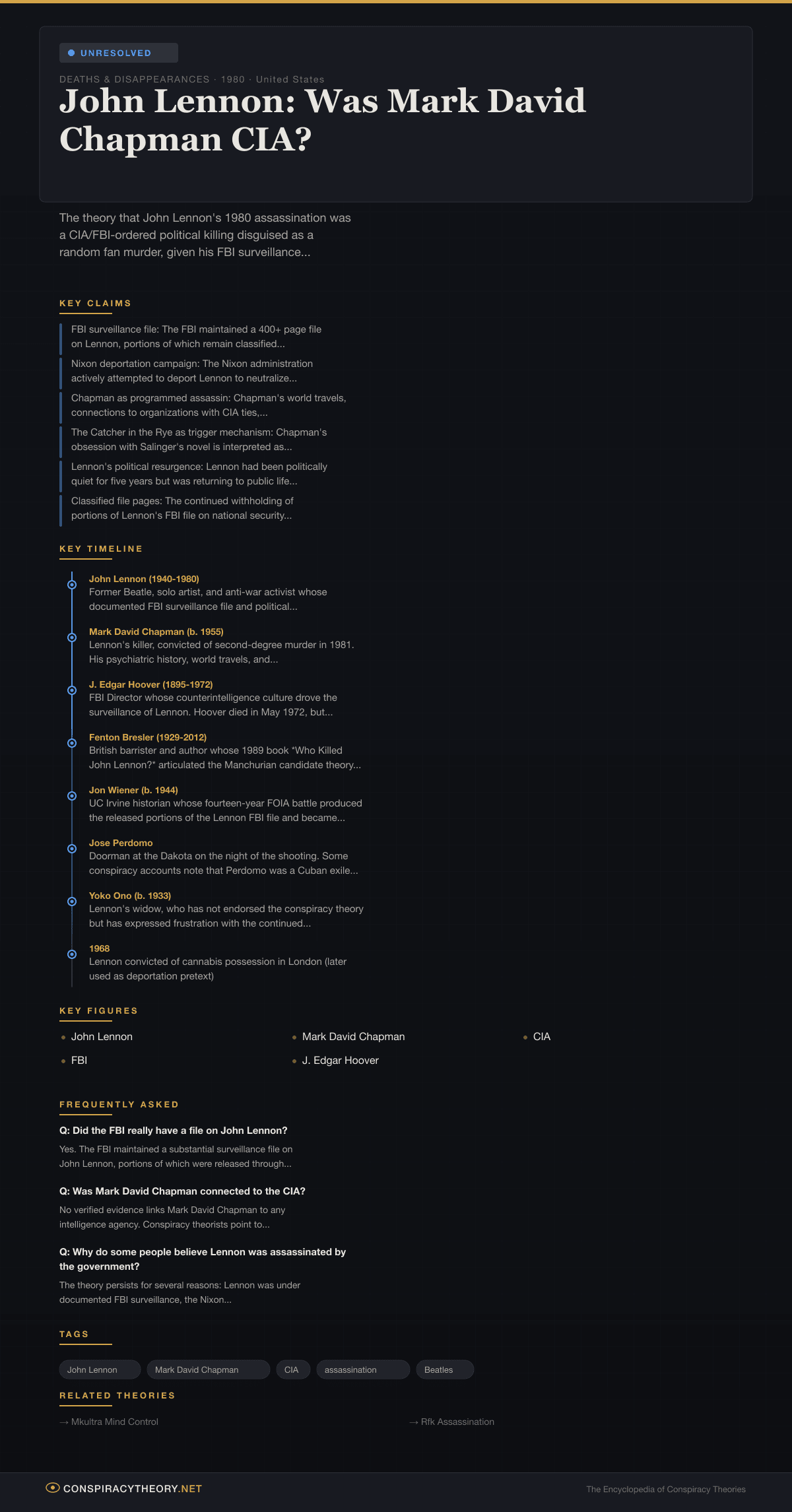No declassified CIA or FBI document has referenced a plot against Lennon. No whistleblower from within the intelligence community has come forward with corroborating testimony in over four decades. The theory relies on inference from the surveillance file, Chapman’s unusual but explainable biography, and the broader pattern of government hostility toward political dissidents — circumstantial threads that, while suggestive to those inclined to see them as a pattern, fall well short of evidence.