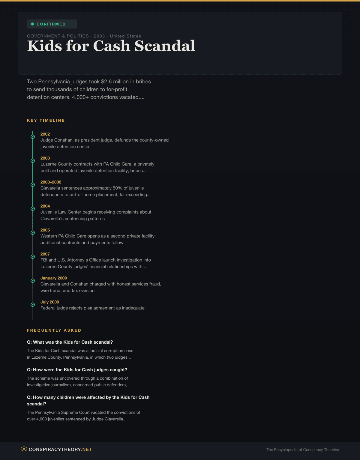 The Kids for Cash scandal is not a conspiracy theory. It is a confirmed criminal conspiracy, proven in federal court, resulting in lengthy prison sentences for both judges and the vacating of over 4,000 juvenile convictions by the Pennsylvania Supreme Court. It stands as one of the most egregious cases of judicial corruption in American history and one of the starkest illustrations of what happens when the profit motive is injected into the juvenile justice system.
