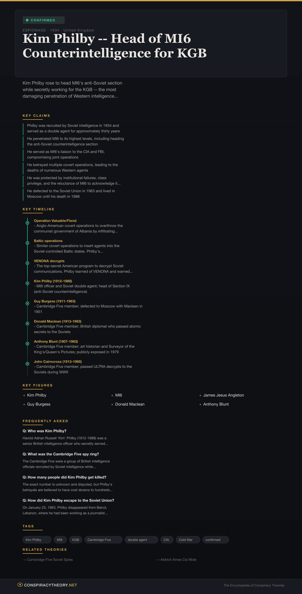 That story is not fiction. It is the life of Harold Adrian Russell “Kim” Philby, and it is one of the most extraordinary confirmed conspiracies of the twentieth century.