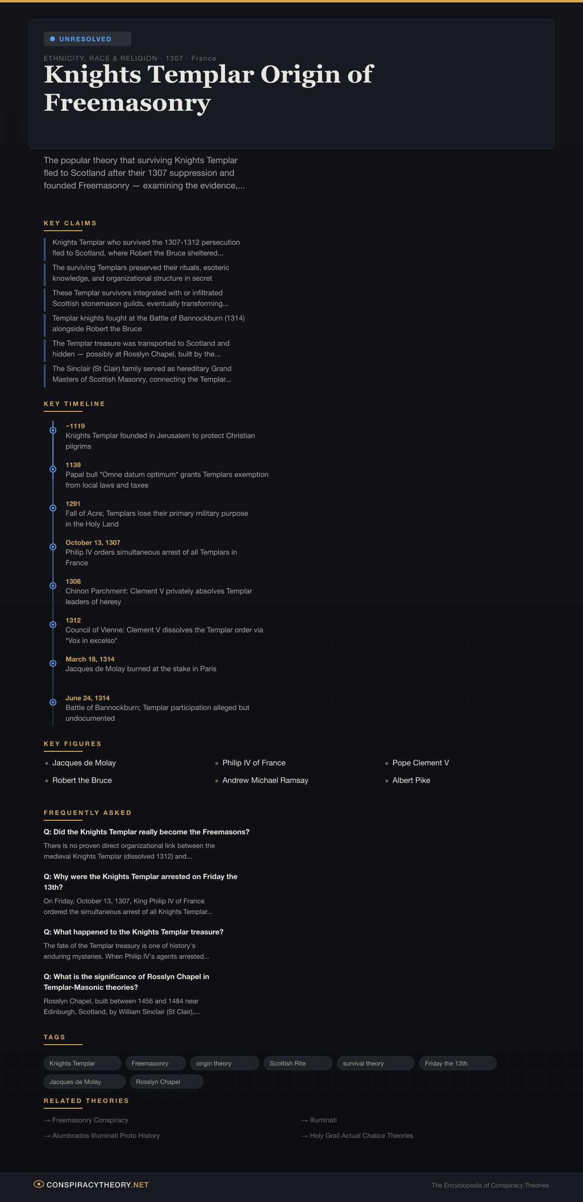 The Knights Templar origin of Freemasonry is a theory proposing that the medieval order of the Knights Templar, officially dissolved in 1312 after arrests and trials orchestrated by King Philip IV of France and Pope Clement V, survived in secret and eventually gave rise to the fraternal organization known as Freemasonry. The theory holds that Templar survivors fled to Scotland — where King Robert the Bruce, himself excommunicated, offered protection from papal authority — and preserved their rituals, knowledge, and organizational structure within the stonemasonry guilds that would eventually become speculative Freemasonry.