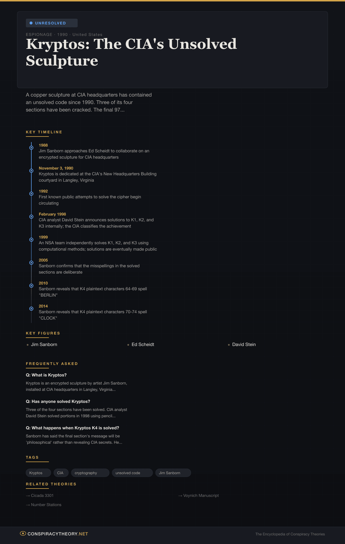 One popular theory holds that the reason K4 remains “unsolved” is that it has been solved — by the CIA, the NSA, or both — and the solution contains information so damaging or embarrassing that the agencies have suppressed it. Proponents note that the CIA classified David Stein’s solutions for over a year and suggest a similar suppression could be permanent. What could K4 say that’s so dangerous? The theories range from the plausible (it references a real CIA operation by name) to the fantastical (it reveals the location of something buried at Langley that the agency doesn’t want found).