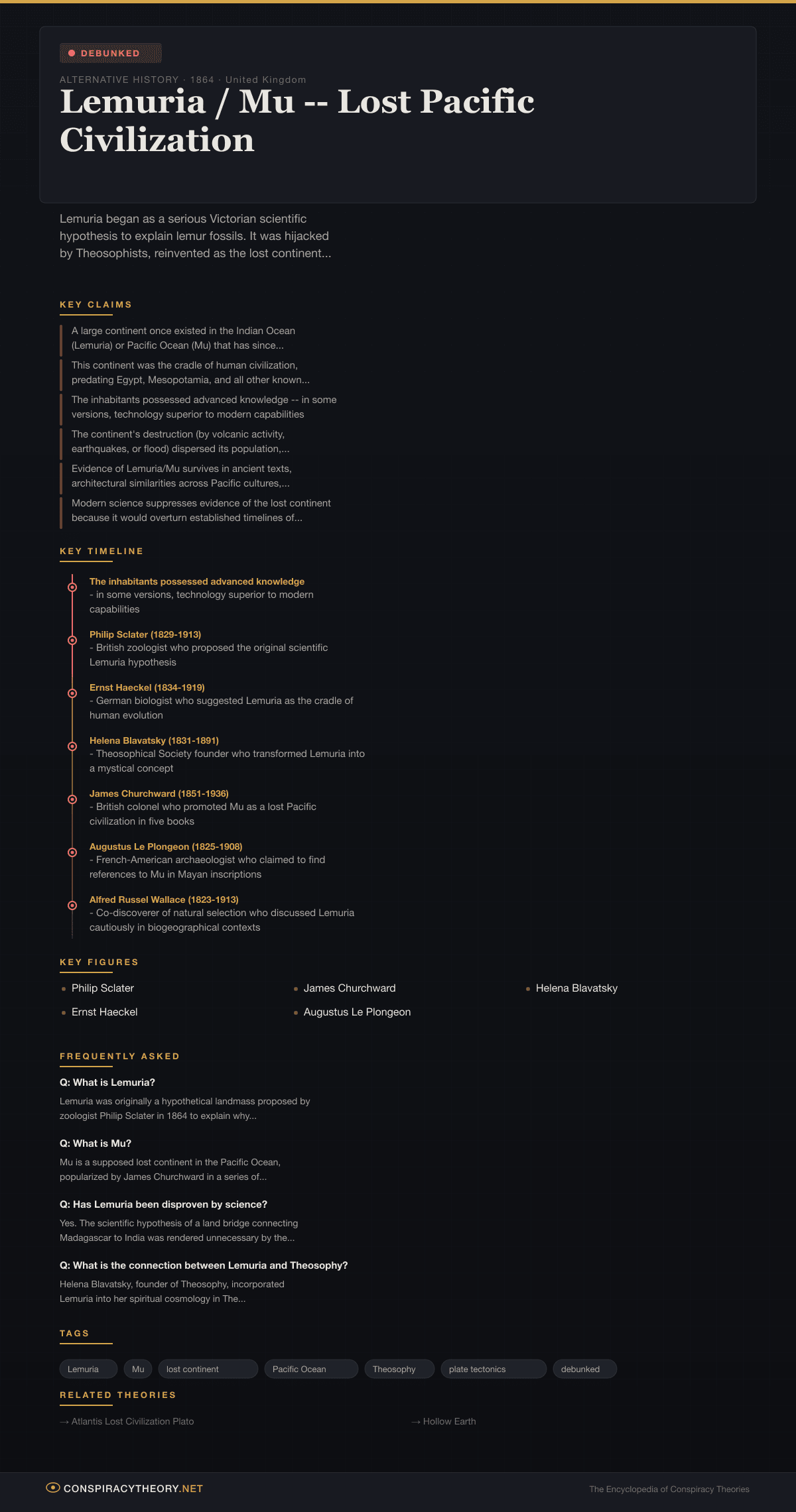 - Atlantis — the archetypal lost continent theory, often paired with Lemuria