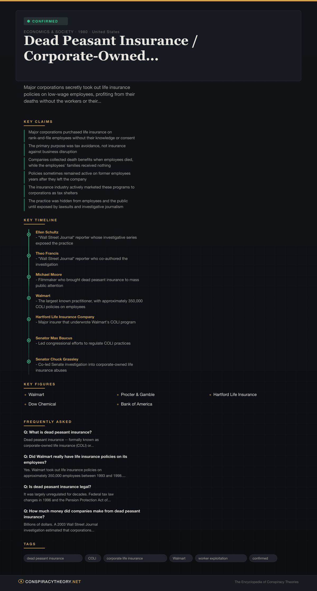 This conspiracy is confirmed. No one disputes the basic facts. Walmart and other corporations have acknowledged their COLI programs, though they have characterized them as legal financial tools rather than morally questionable schemes. The debate is not about whether dead peasant insurance existed — it is about whether the remaining forms of corporate-owned life insurance are adequately regulated.