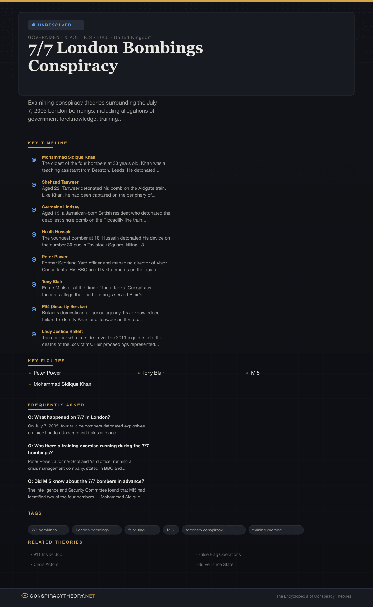 Unlike many conspiracy theories surrounding terrorist attacks, the 7/7 theories are complicated by documented failures within British intelligence. Official inquiries confirmed that MI5 had prior contact with two of the four bombers during surveillance operations targeting other suspects but had failed to identify them as threats. This acknowledged intelligence failure has provided a foundation upon which more elaborate theories of deliberate complicity have been constructed. The theory is classified as unresolved — not because the false flag claims have credible evidentiary support, but because legitimate questions about the extent of intelligence failures and possible informant relationships have never been fully answered by public inquiries.