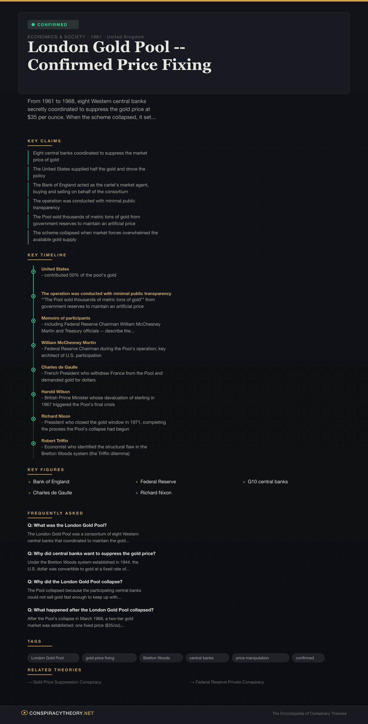 This conspiracy is confirmed and is not disputed by any of the participating institutions. The Federal Reserve, the Bank of England, and other central banks have acknowledged the Pool’s existence and operations. It is documented in mainstream economic history textbooks and central bank archives.