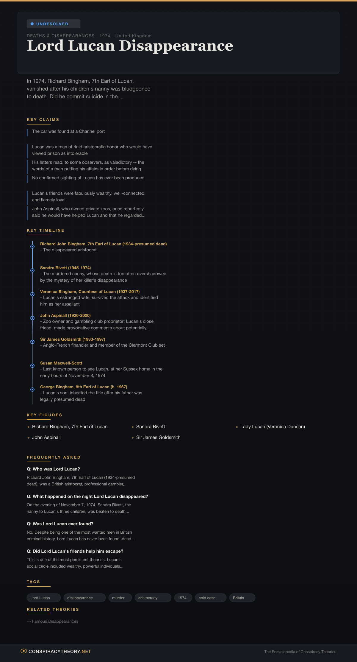 He has never been seen again — at least, not definitively. Over five decades of reported sightings from Africa, Australia, South America, India, and Ireland have produced nothing confirmed. The question that has captivated Britain ever since is deceptively simple: what happened to Lord Lucan? Did he kill himself and slip into the Channel? Or did his wealthy, well-connected friends — the gambling aristocrats of the Clermont Club — smuggle him to safety somewhere beyond the reach of British justice?