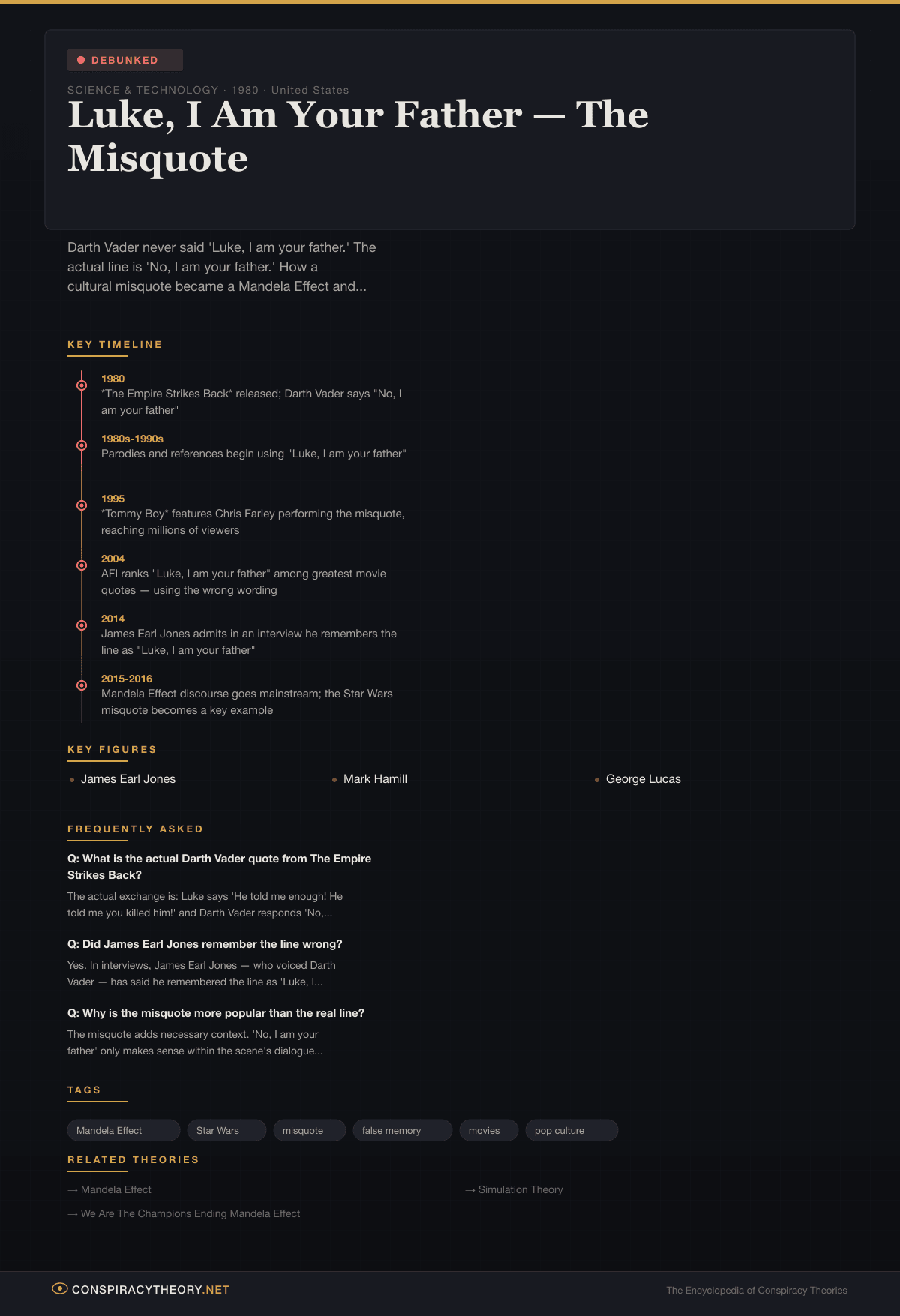 Mandela Effect believers cite this as evidence that something changed — how could the actor who said the line remember it wrong unless reality itself shifted? The cognitive science explanation is less dramatic but more interesting: Jones, like everyone else, was exposed to the misquote thousands of times in the four decades after recording the original. His memory of his own performance was overwritten by the same cultural repetition that affected everyone else.