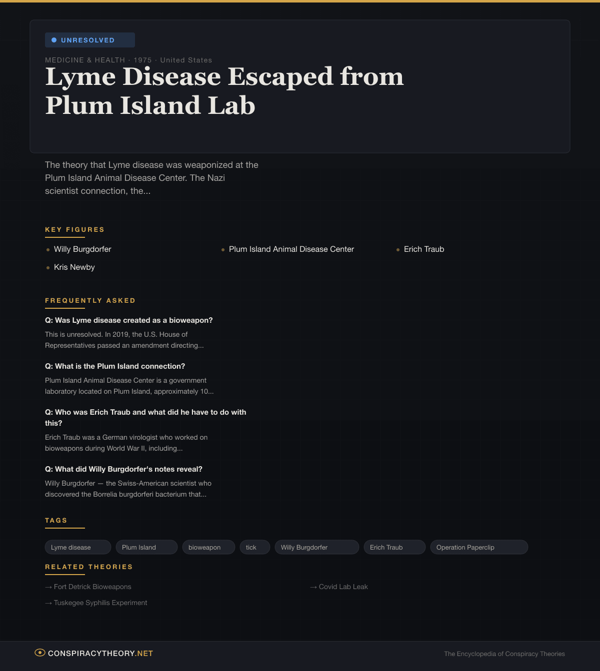 The Lyme disease bioweapon theory occupies an unusual position: it’s taken seriously by enough mainstream figures to have been the subject of a congressional vote, but it lacks the definitive evidence needed to resolve the question. This liminal status keeps it alive in ways that either confirmation or debunking would not.