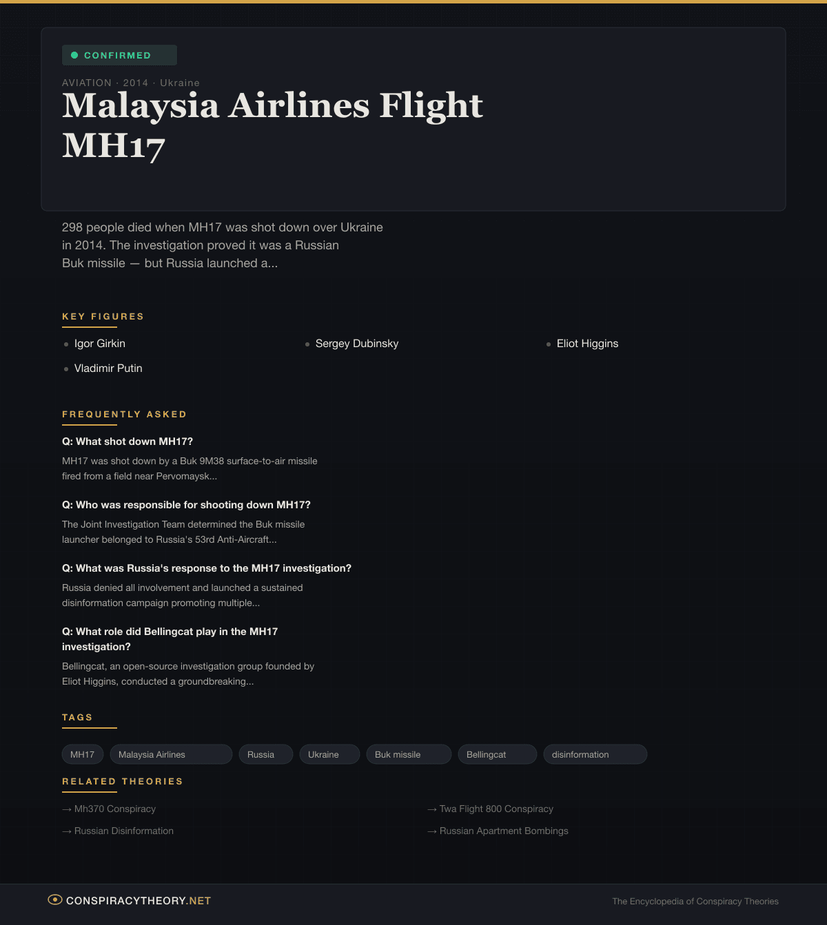 The MH17 shootdown intersects with several other documented conspiracy narratives. The disappearance of Malaysia Airlines Flight MH370 four months earlier — involving the same airline and the same aircraft type — created a bizarre resonance that conspiracy theorists exploited to link the two events. Russia’s MH17 disinformation campaign was part of a broader pattern of state-sponsored information warfare that has been documented extensively by Western intelligence agencies and media researchers. The case also echoes historical controversies over aviation disasters like TWA Flight 800, though in that case the conspiracy theories challenged the official explanation rather than defending it. And the Russian government’s willingness to deny proven facts and fabricate evidence mirrors patterns seen in other cases of Kremlin-linked violence, including the 1999 apartment bombings that launched Putin’s political career.