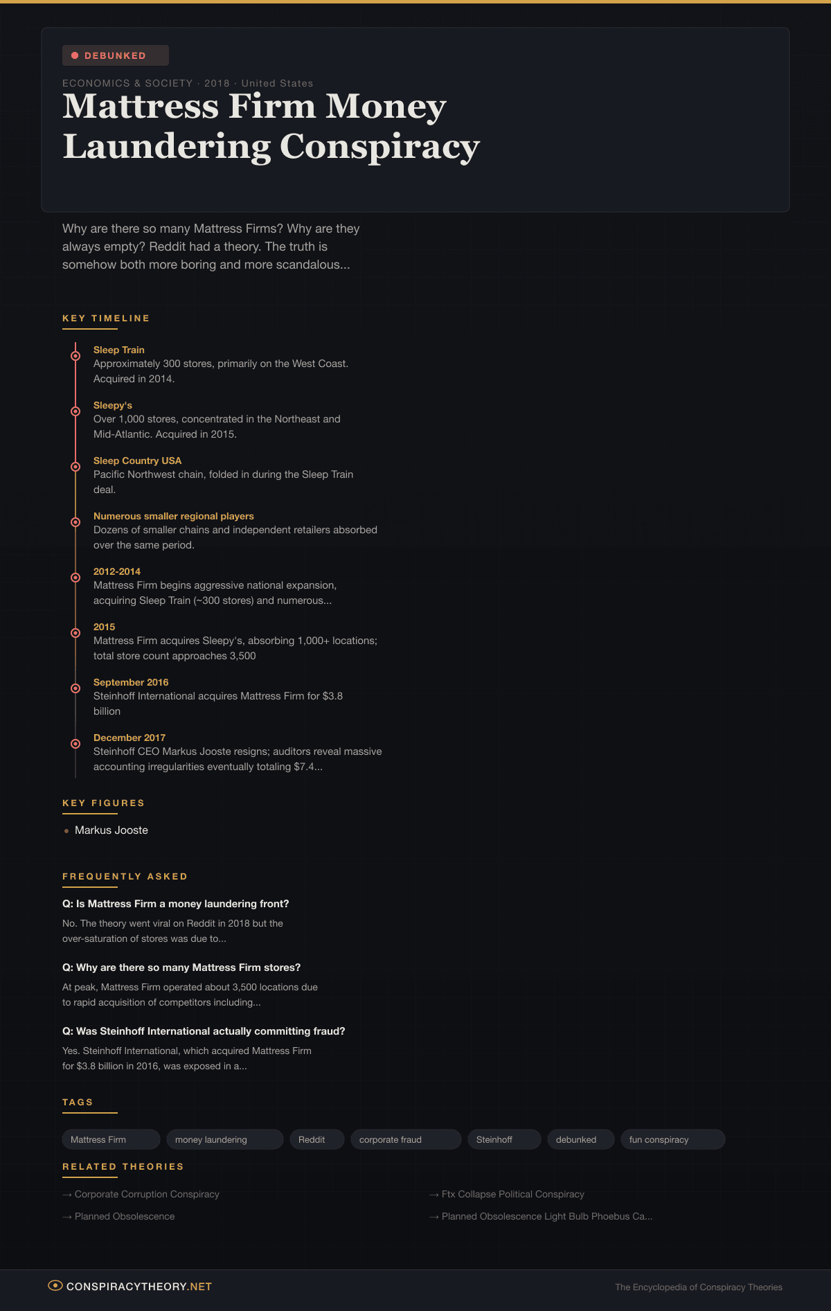 The post appeared on r/conspiracy in January 2018, and it was, in the way of all great conspiracy posts, devastating in its simplicity. User u/Doxep didn’t claim to have insider knowledge. They didn’t produce leaked documents. They simply asked the question that every American had been too polite or too busy to ask: why are there so many Mattress Firms, and why are they always empty?