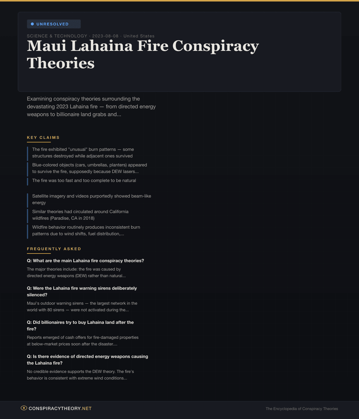 The Lahaina fire illustrates how documented negligence creates fertile ground for conspiracy theories. The genuine failures — no sirens, delayed water, blocked roads, inadequate FEMA response, immediate land offers — are so numerous and so consequential that the question “was this intentional?” becomes emotionally compelling even without evidence of deliberate intent.