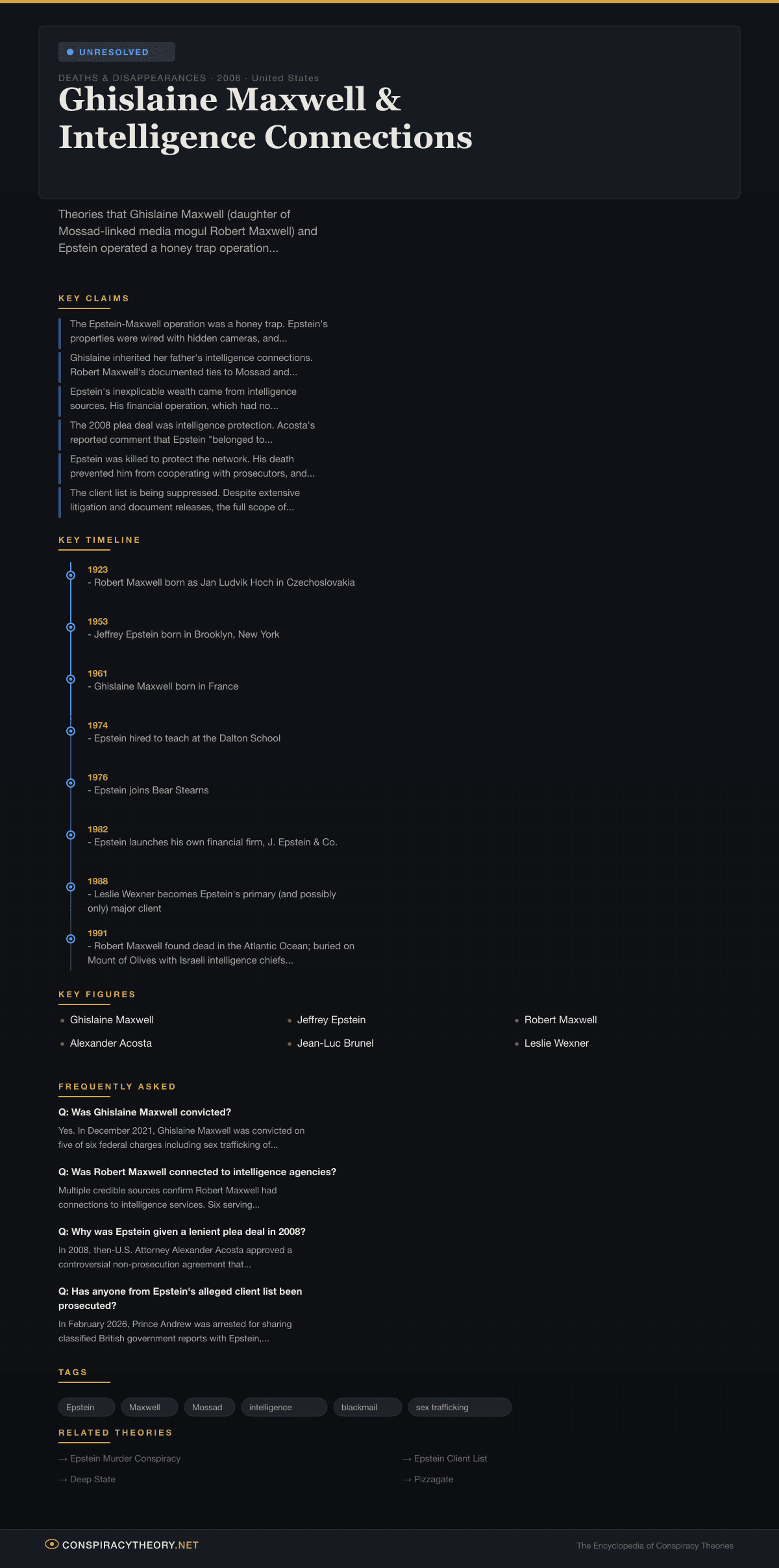 Ghislaine Maxwell was arrested in July 2020 at a secluded property in Bradford, New Hampshire, that she had purchased through a shell company. She was convicted in December 2021 on five of six federal counts and sentenced to 20 years in prison. She has maintained her innocence and filed appeals. From prison, she has given interviews suggesting she believes Epstein was murdered and that she herself is in danger — claims that, whatever their motivation, align with the intelligence-operation theory.