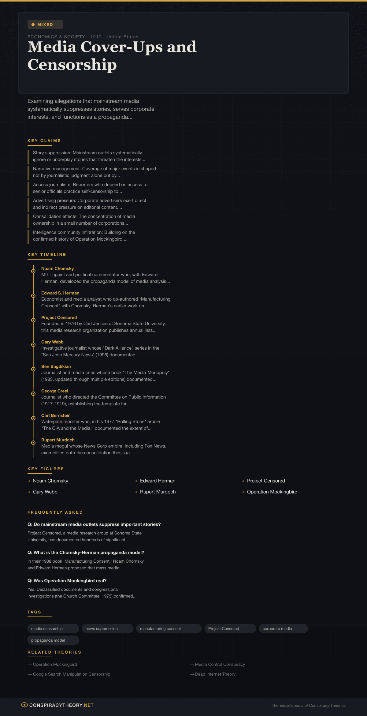 The “mixed” status of this theory reflects a genuine complexity. The structural critique of media — that ownership concentration, advertising dependence, source relationships, and institutional cultures create systematic biases favoring powerful interests — is supported by decades of academic research and documented cases. This is not properly a conspiracy theory at all but a well-established finding of media sociology.