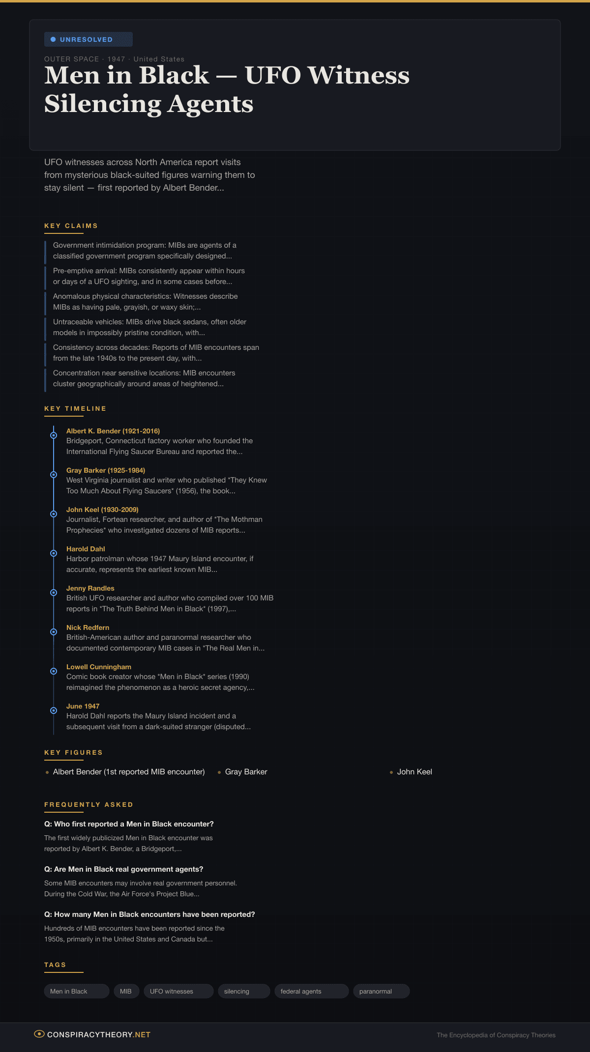 The Men in Black phenomenon sits at one of the strangest intersections in American paranormal history — the point where documented government behavior, Cold War anxiety, and something genuinely inexplicable converge into a single, unsettling narrative. The basic claim is this: after witnessing a UFO, people receive visits from dark-suited, dark-car-driving figures who know details about the sighting they should not know, who behave in ways that range from unsettling to otherworldly, and who deliver explicit warnings to stop talking about what was seen.