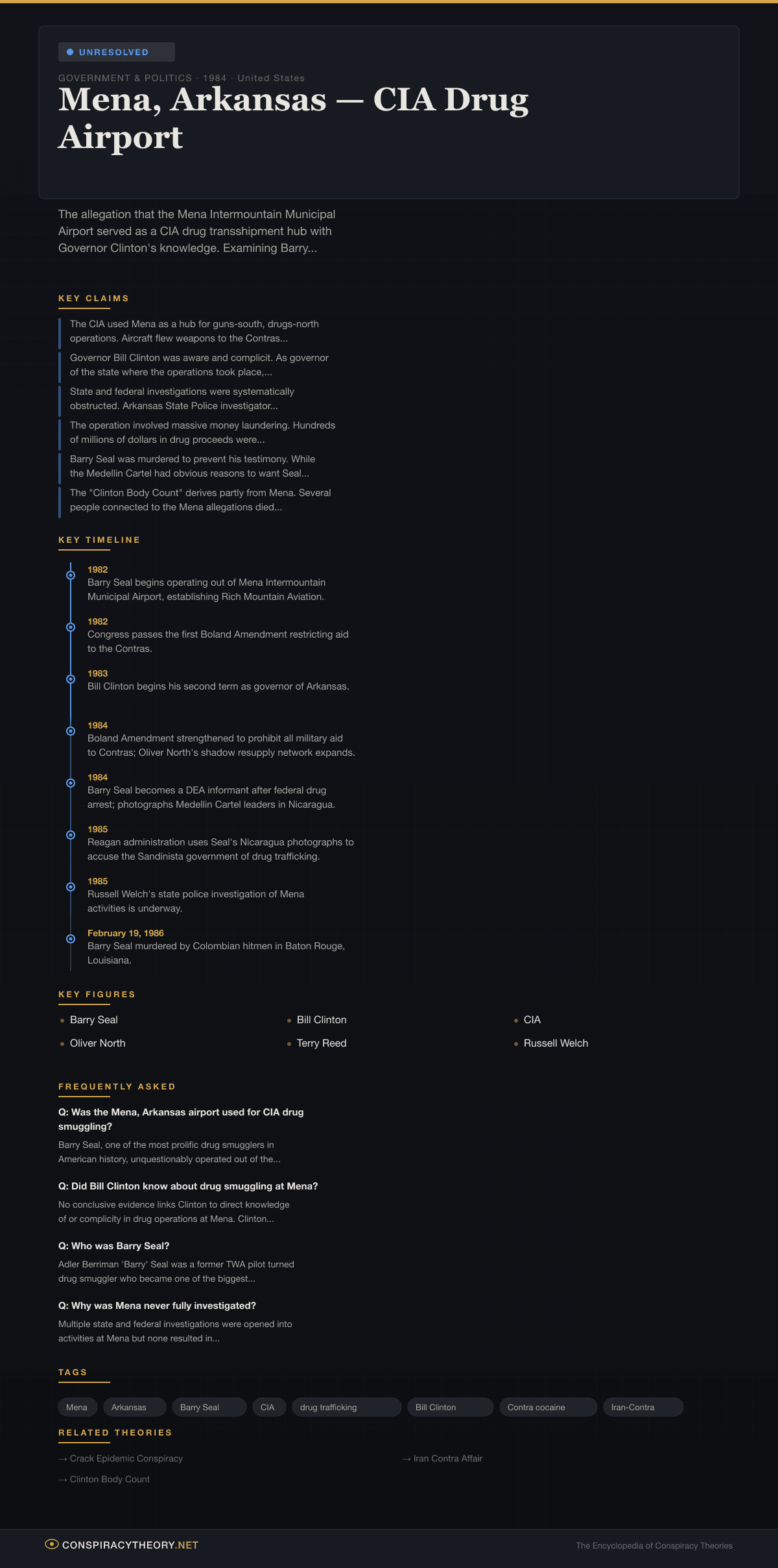 In the rolling Ouachita Mountains of western Arkansas, population 5,600 and falling, sits the small city of Mena. Its intermountain municipal airport, built during World War II as a military training facility, should have been one of the least interesting pieces of aviation infrastructure in the United States. Instead, it became the locus of one of the most persistent and politically explosive conspiracy theories of the late twentieth century — a theory that connects the CIA, Colombian cocaine, the Nicaraguan Contras, and a future President of the United States in a narrative that is either a devastating indictment of American governance or a masterwork of partisan fever-dreaming, depending on whom you ask.