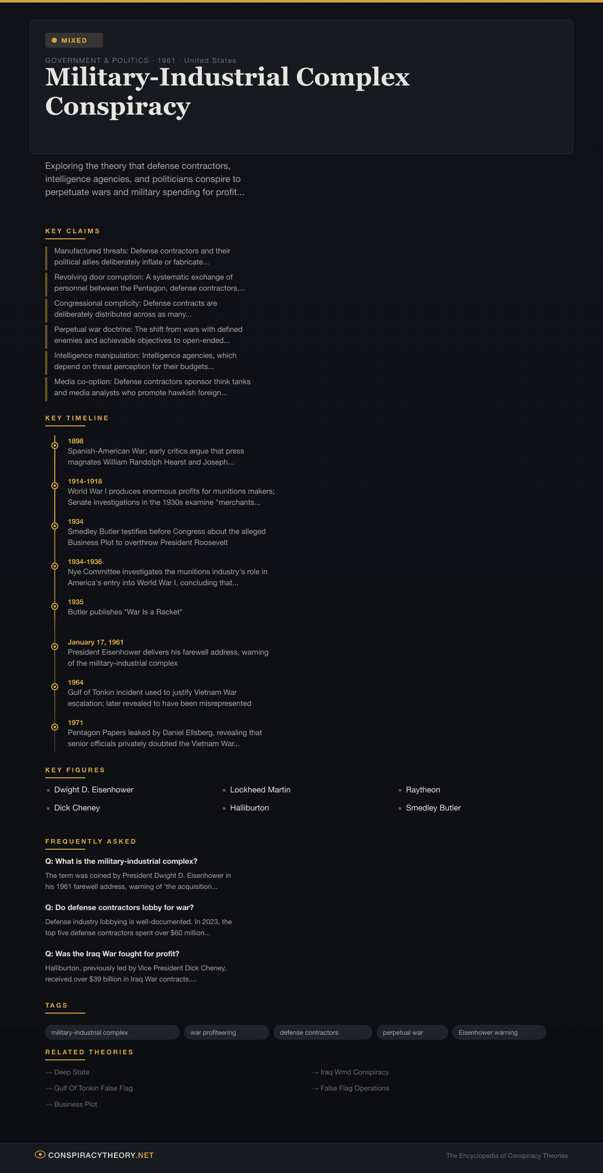 The military-industrial complex theory receives the “mixed” classification because it encompasses claims spanning the full spectrum from documented fact to unsupported conjecture.