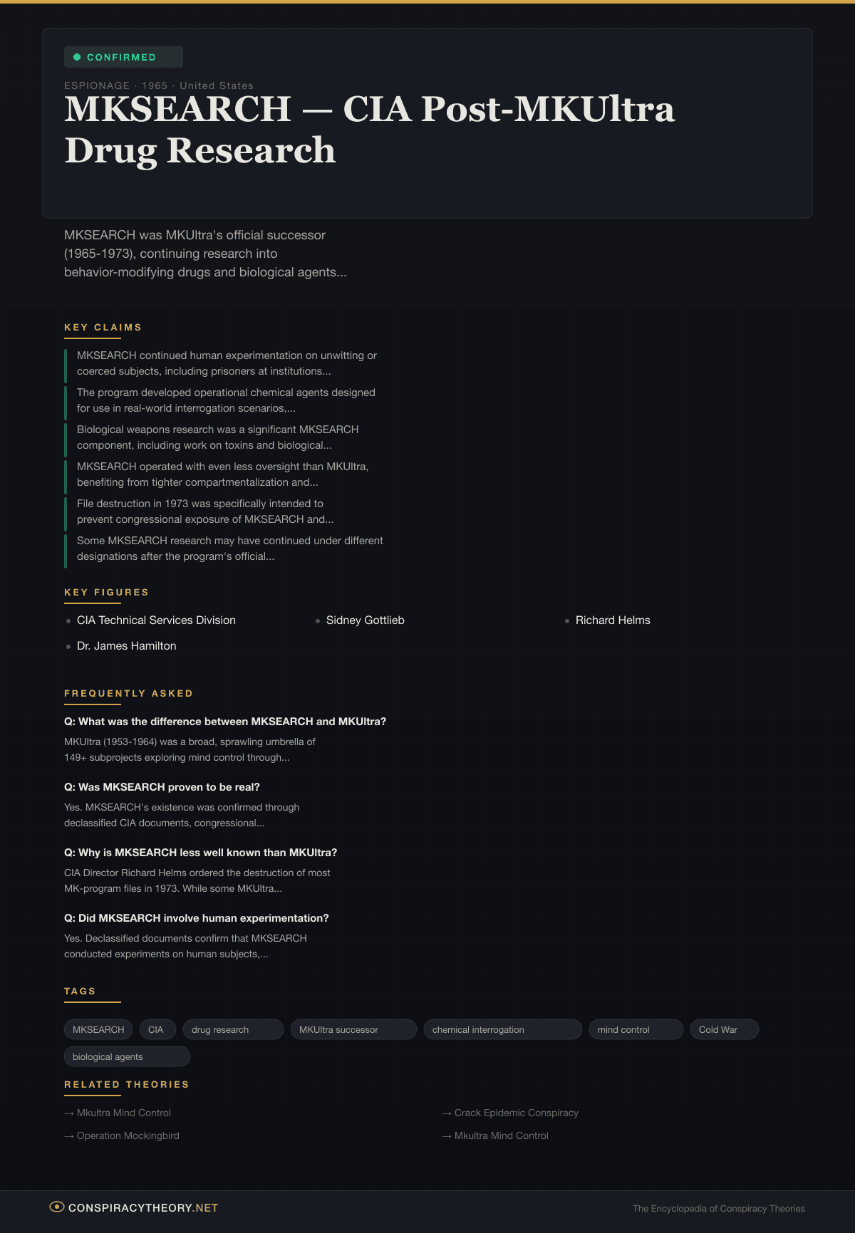 MKSEARCH falls into the rare category of conspiracy theories that are entirely verified. The program existed. The U.S. government has acknowledged it. The primary debates are not about whether MKSEARCH was real, but about its scope, its specific activities, and whether similar programs continued after its official termination.
