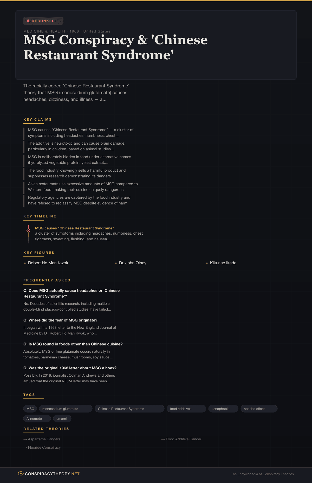 The MSG panic also served as a template for subsequent food additive scares, including fears about aspartame and food dyes. It demonstrated how a single anecdotal report, amplified by media and cultural bias, can overpower decades of rigorous science — a pattern that recurs across health-related conspiracy theories.
