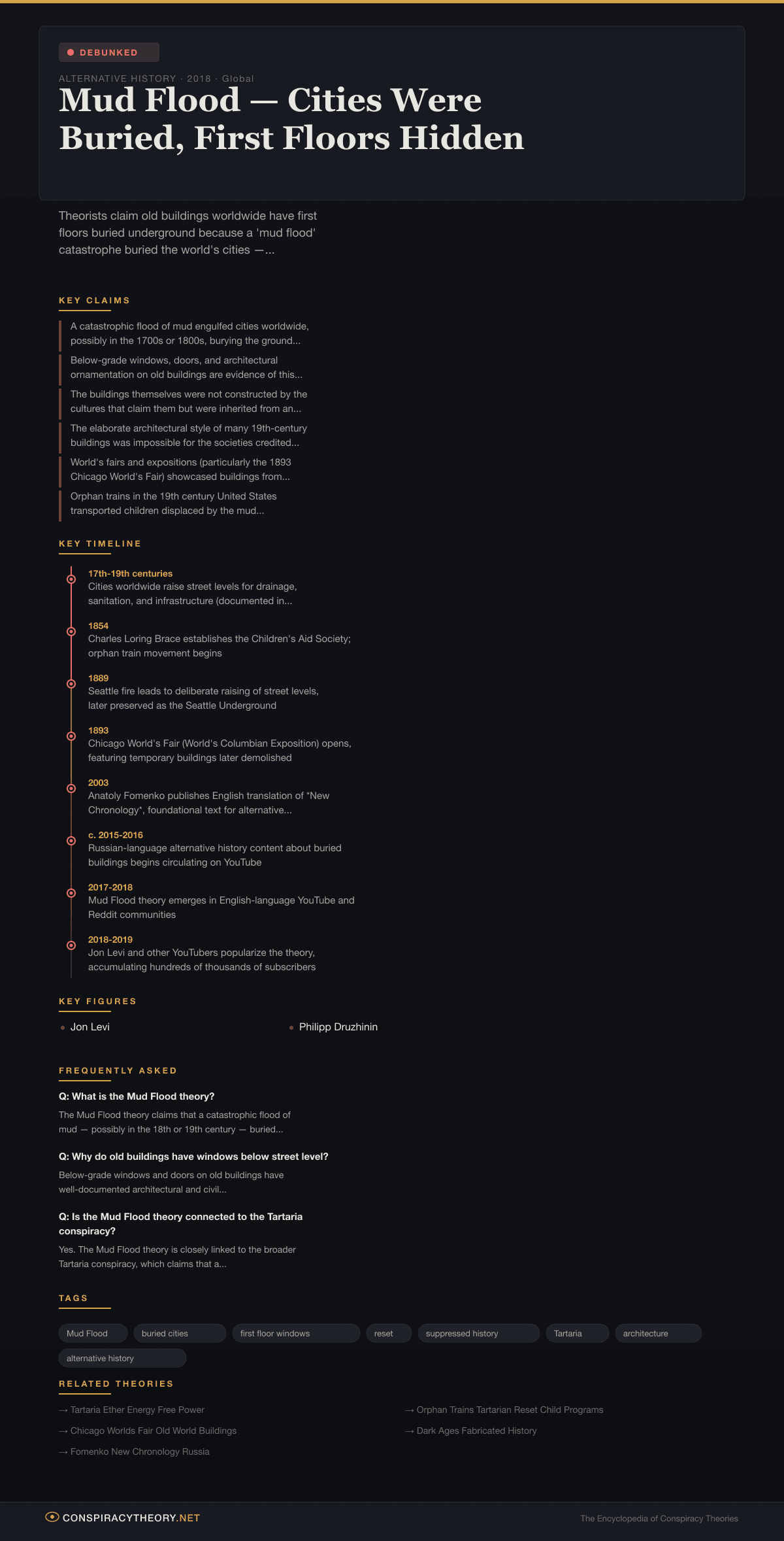 Debunked: The Mud Flood theory is debunked on multiple grounds. Below-grade architectural features have well-documented explanations in civil engineering, urban planning, and architectural design. Street-level raising is extensively documented in municipal records worldwide. No geological evidence supports a catastrophic mud flood event. Construction records exist for the buildings in question. The theory’s foundational premise — that the buildings are older than their documented construction dates — is contradicted by physical evidence including construction materials, building techniques, and documentary records.