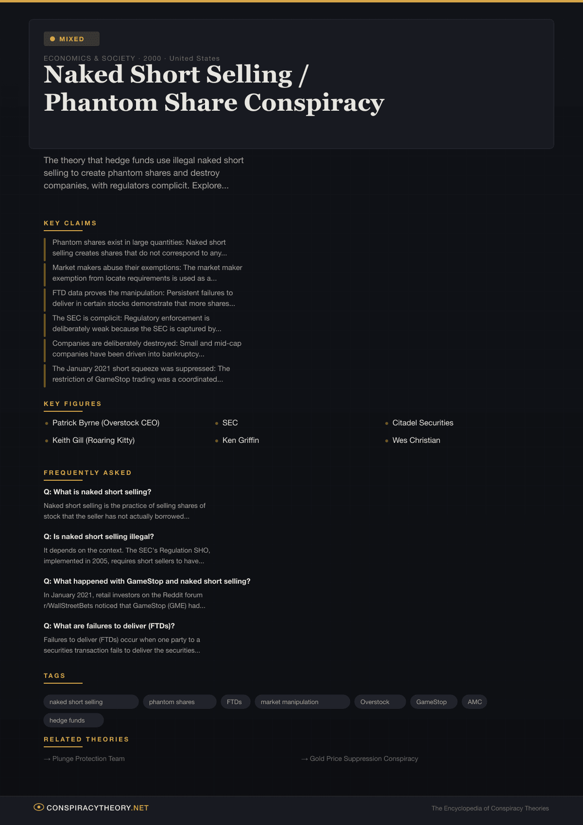 In the world of stock market conspiracy theories, naked short selling occupies a peculiar position: it is simultaneously a confirmed, documented form of market manipulation that regulators have acknowledged and sanctioned, and the foundation for a sprawling, sometimes extravagant conspiracy theory that extends far beyond what the evidence supports. The confirmed part is that naked short selling — selling shares you have not actually borrowed and may not even exist — is a real practice that has been used to manipulate stock prices, that regulatory enforcement has been inconsistent, and that the 2021 GameStop saga demonstrated in dramatic fashion that short interest in a stock can exceed the total number of shares that actually exist. The conspiratorial extension — that a shadowy network of hedge funds, prime brokers, market makers, and complicit regulators systematically uses naked shorting to destroy companies, control markets, and extract wealth from retail investors at industrial scale — is where the theory ventures beyond established fact into contested territory.