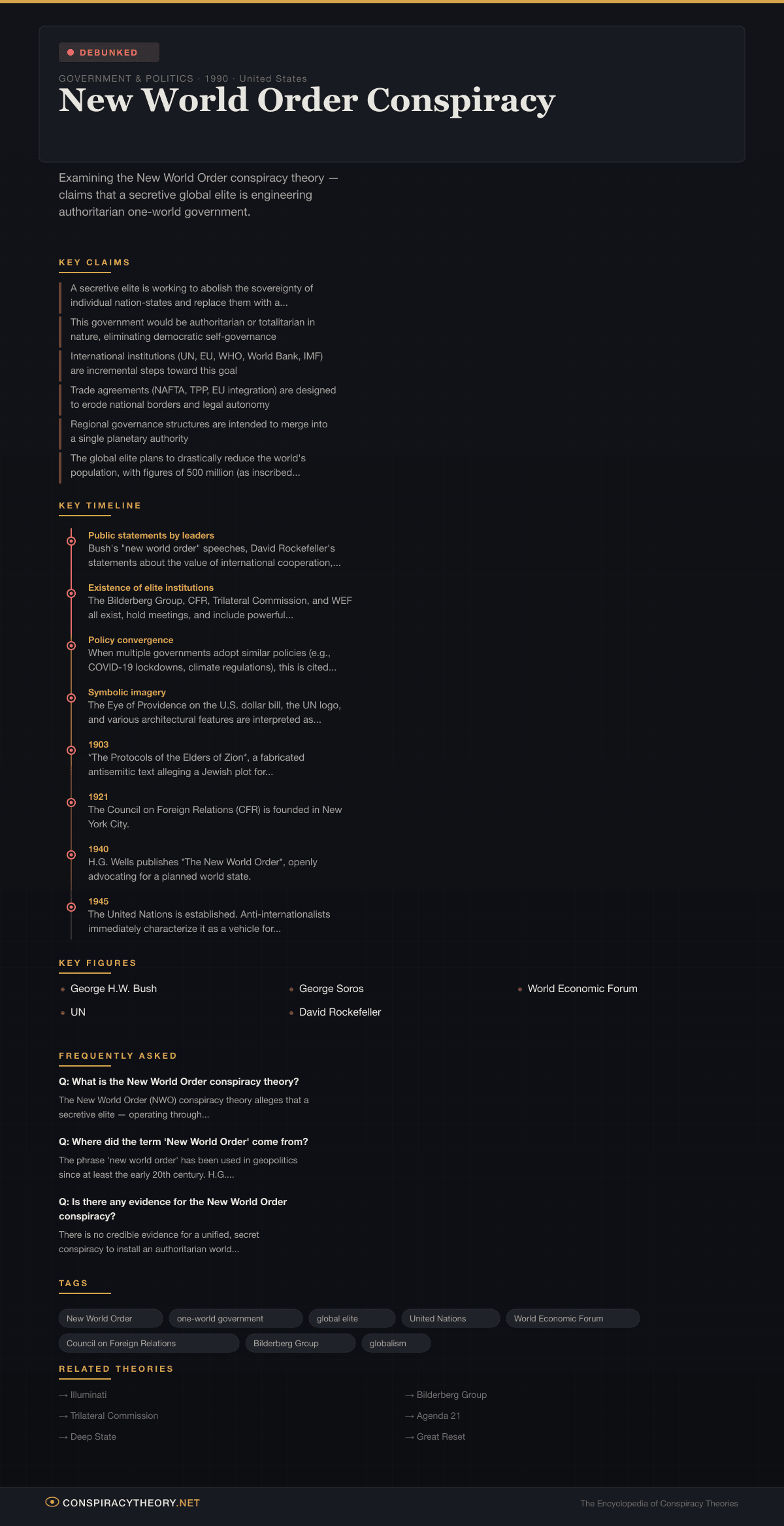 The fundamental problem with the NWO conspiracy theory is not that powerful institutions and wealthy individuals exist — they clearly do — but that the theory posits a level of coordinated, secret, intergenerational planning that is contradicted by readily available evidence:
