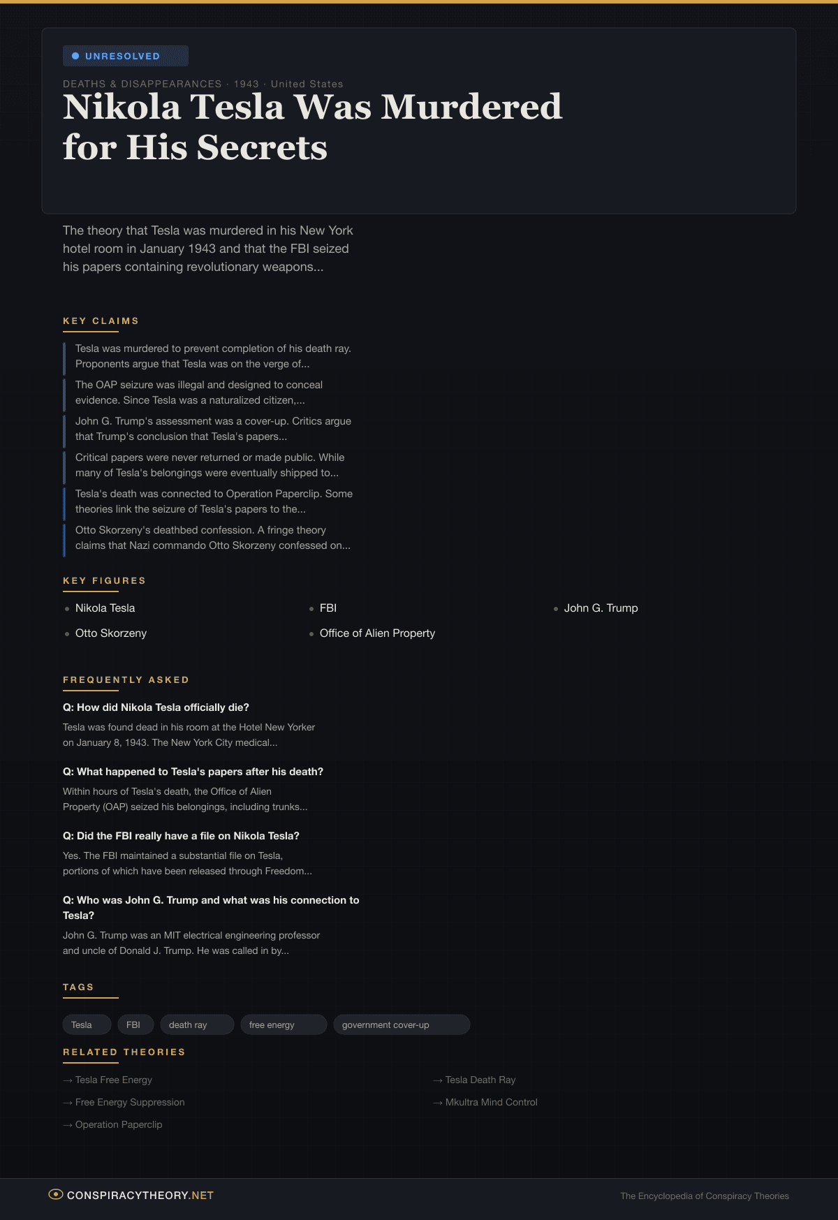 Nikola Tesla, the pioneering Serbian-American inventor and electrical engineer, was found dead in his room at the Hotel New Yorker in Manhattan on January 8, 1943. He was 86 years old. The official cause of death was coronary thrombosis, and no autopsy was performed. Within hours of the discovery of his body, agents from the Office of Alien Property (OAP) descended on his hotel room and seized multiple trunks containing his personal papers, notebooks, and documents — despite the fact that Tesla had been a naturalized United States citizen since 1891.