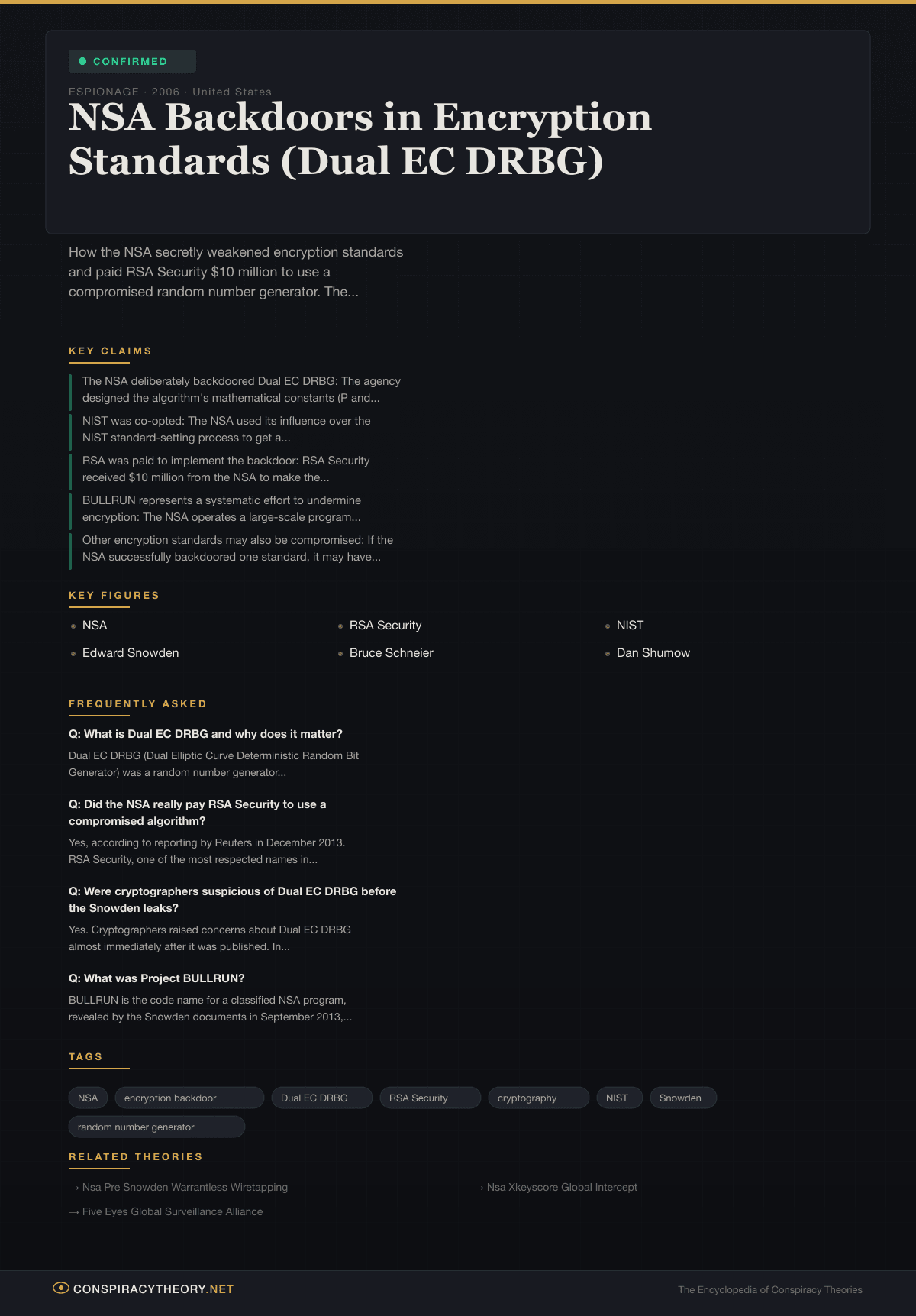 This case requires no debunking — it is confirmed. The only remaining questions involve scope: how many other encryption standards has the NSA compromised? How many technology companies have similar arrangements? How extensively has the BULLRUN program been applied?