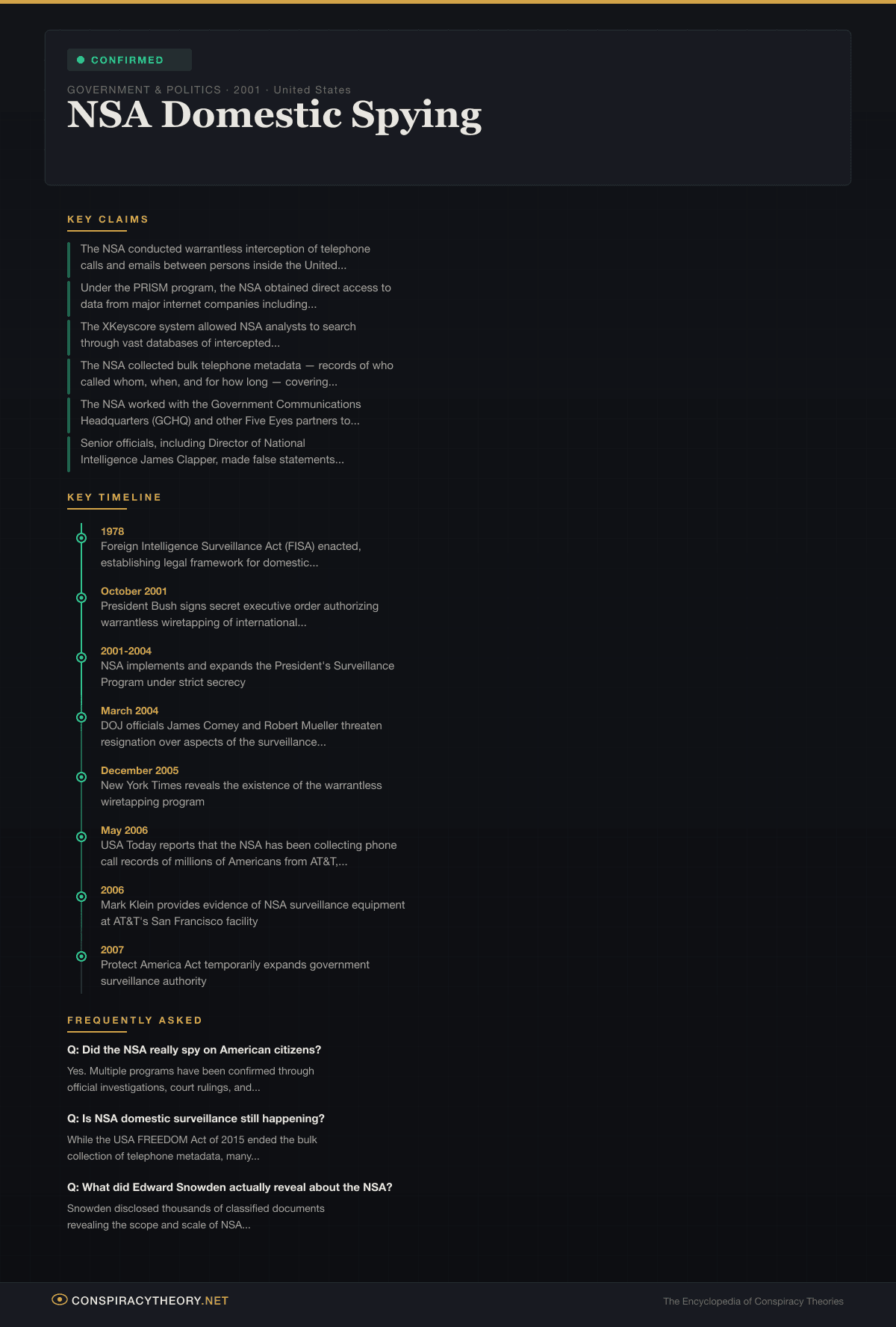 As a confirmed conspiracy, the central claims of NSA domestic spying are not in dispute. The U.S. government has acknowledged the existence of the programs, and multiple independent investigations have verified their scope.