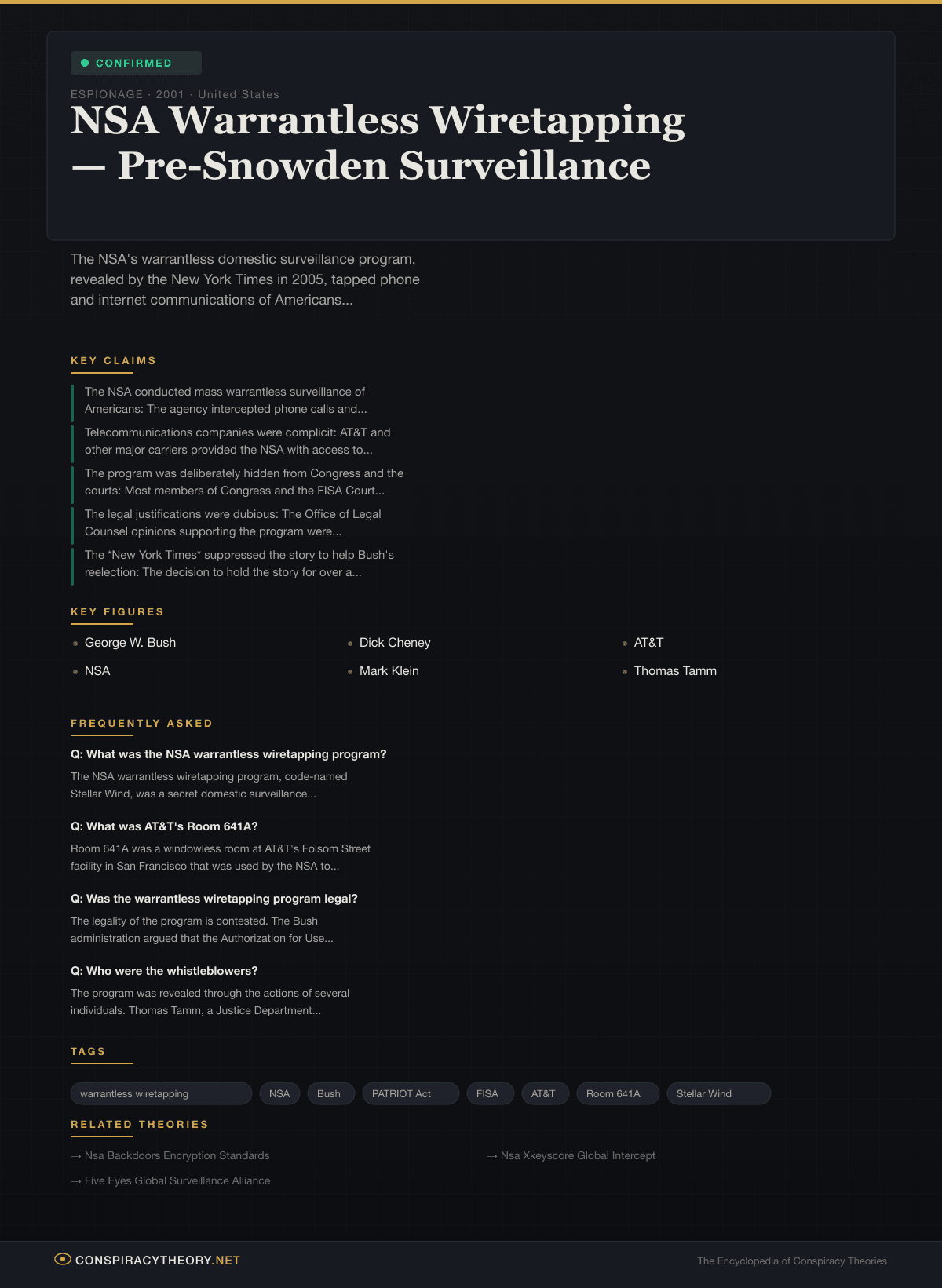 This theory is classified as confirmed — the Bush administration acknowledged the program’s existence, its legal basis (however contested), and its operational scope. Subsequent investigations, whistleblower disclosures, and document releases have filled in additional details about the program’s breadth and the infrastructure that supported it.