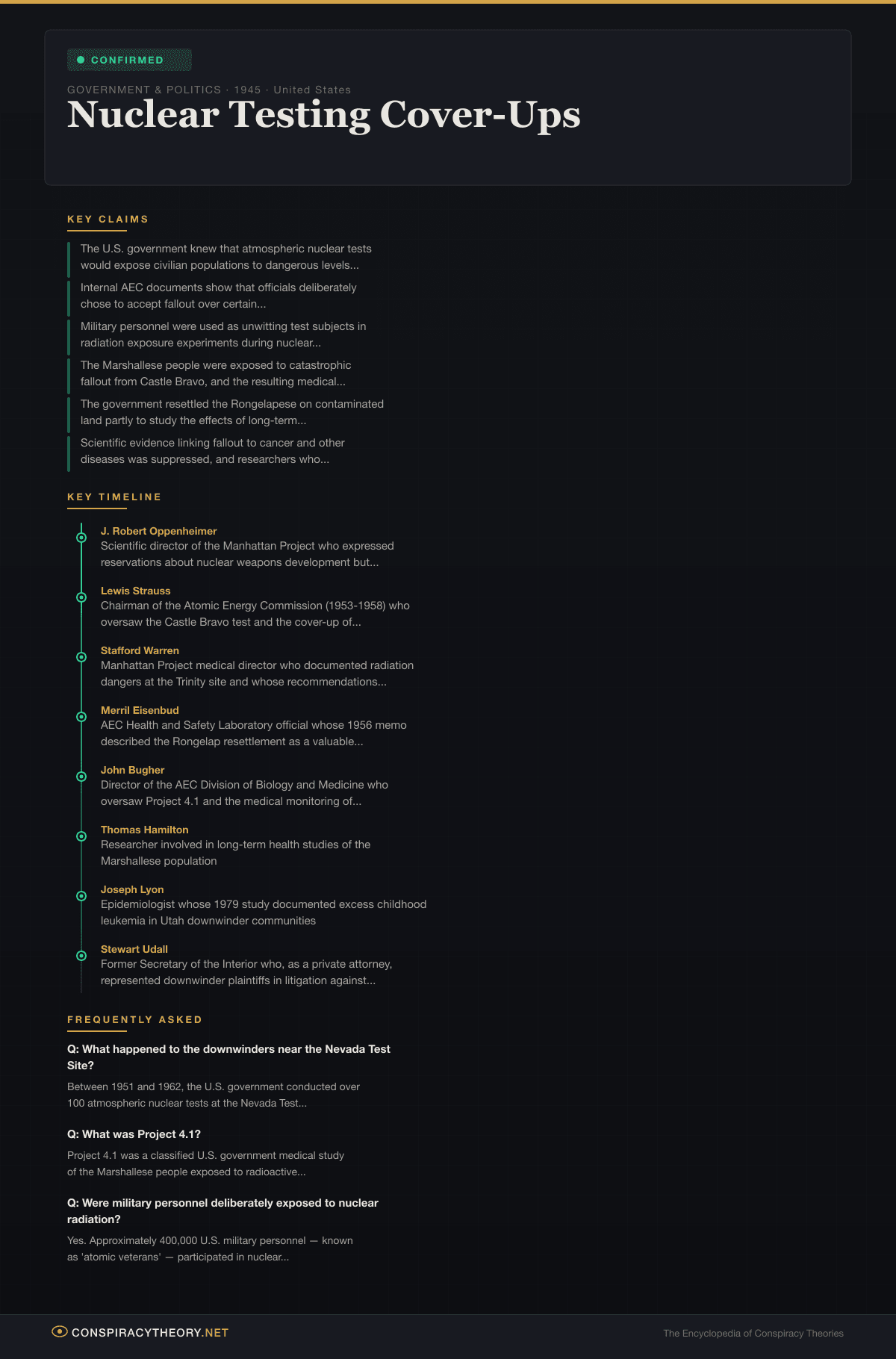 This entry is classified as “confirmed” because the core allegations — that the government knew nuclear testing posed serious health risks, concealed those risks from affected populations, and in some cases deliberately used human beings as radiation research subjects — have been established through declassified documents, congressional investigations, government admissions, and the passage of federal compensation legislation that constitutes an official acknowledgment of wrongdoing.